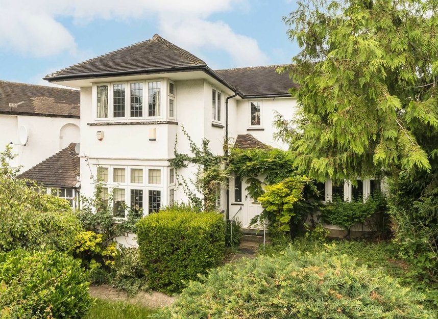 A three bedroom end of terrace family home located on Pollards Hill South, screen behind a mature front garden with with driveway and garage.