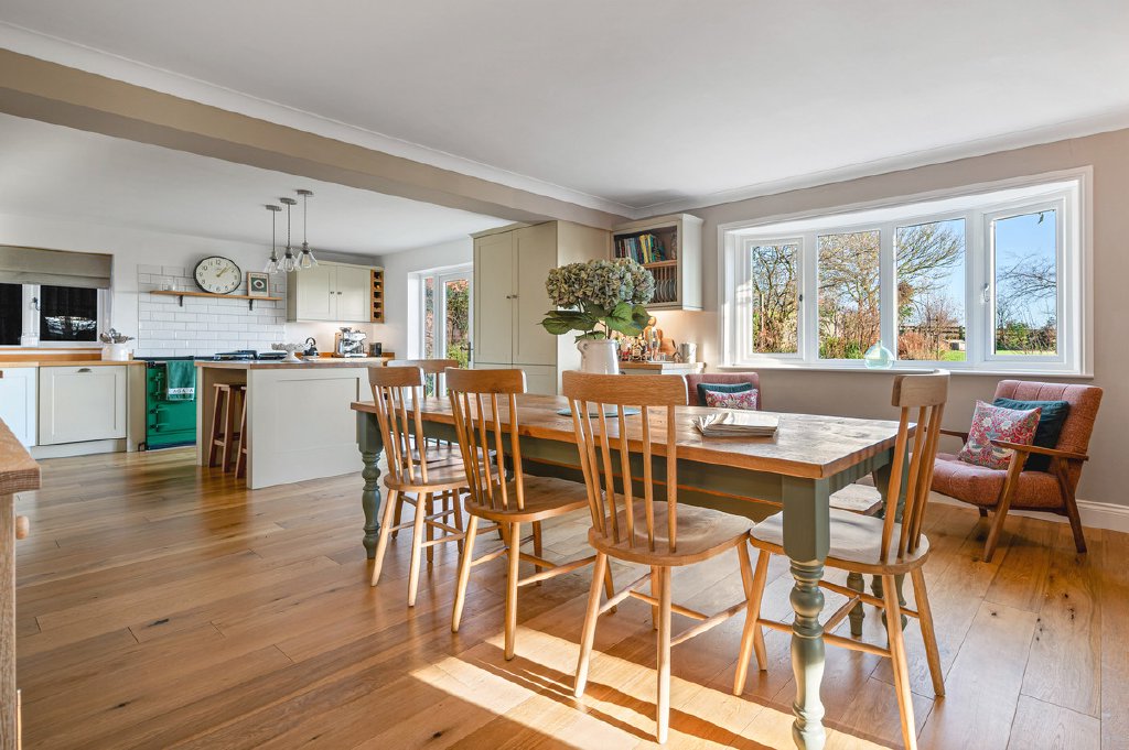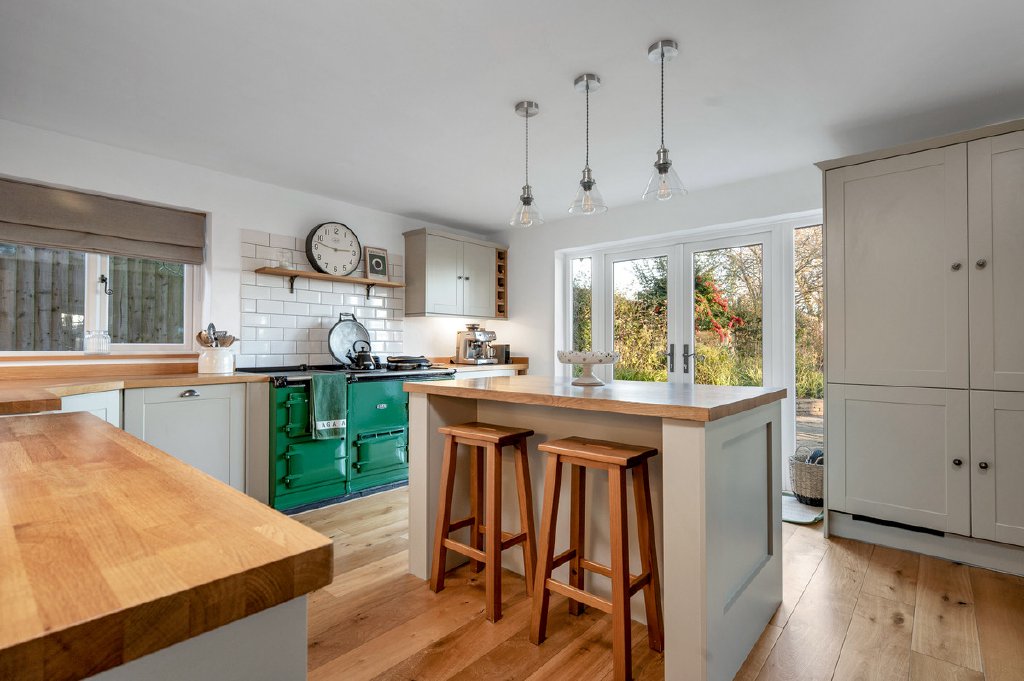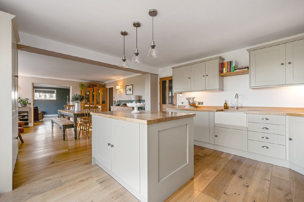 The property is entered through an entrance porch into a large, central hallway with open staircase. Double doors from the hall open into a large sitting room with log burner and Frech doors to rear. The kitchen which is garden facing is particularly impressive. Extremely spacious the kitchen which French doors to the rear garde includes a generous dining area. Newly fitted in a traditional style, Burford Grey coloured cabinets under Oak worksurfaces wrap around a central island/breakfast bar. In addition to a range of integrated appliances is a four oven mains gas fired Aga in English Racing Green.