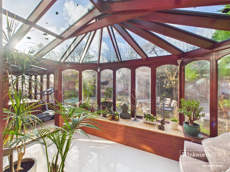 The ground floor welcomes you with an inviting entrance hall giving access to a cloakroom and a spacious living room, which enjoys a wonderfully private rear aspect. From the lounge, two connected conservatories create exceptional additional living space—one arranged as a comfortable sitting area, the other featuring a luxurious sunken hot tub, offering the perfect spot for year-round relaxation.
