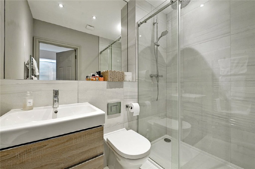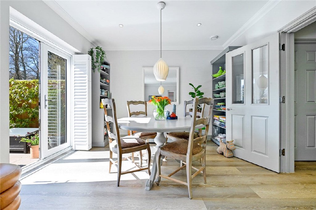 Upstairs, there are three double bedrooms. The principal bedroom includes an en-suite shower room, while a stylish family bathroom serves the remaining rooms. All bedrooms are fitted with built-in wardrobes, with the third bedroom, currently used as a study, featuring additional bespoke cabinetry. Throughout the home, high-quality shutters add a refined and contemporary finish to every window.