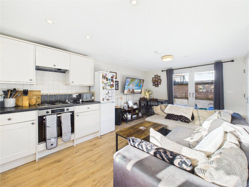 Upon entering, a small hallway gives access to a guest cloakroom before opening into a spacious dual-aspect, open-plan living area. This modern sociable space features a sleek, well-equipped kitchen with an excellent range of fitted units and ample room for appliances, alongside comfortable seating and dining areas. Double doors lead out to an enclosed courtyard garden, providing a private spot for outdoor dining and relaxation.