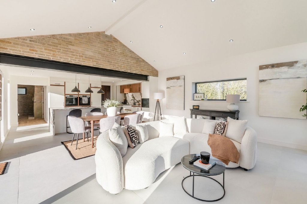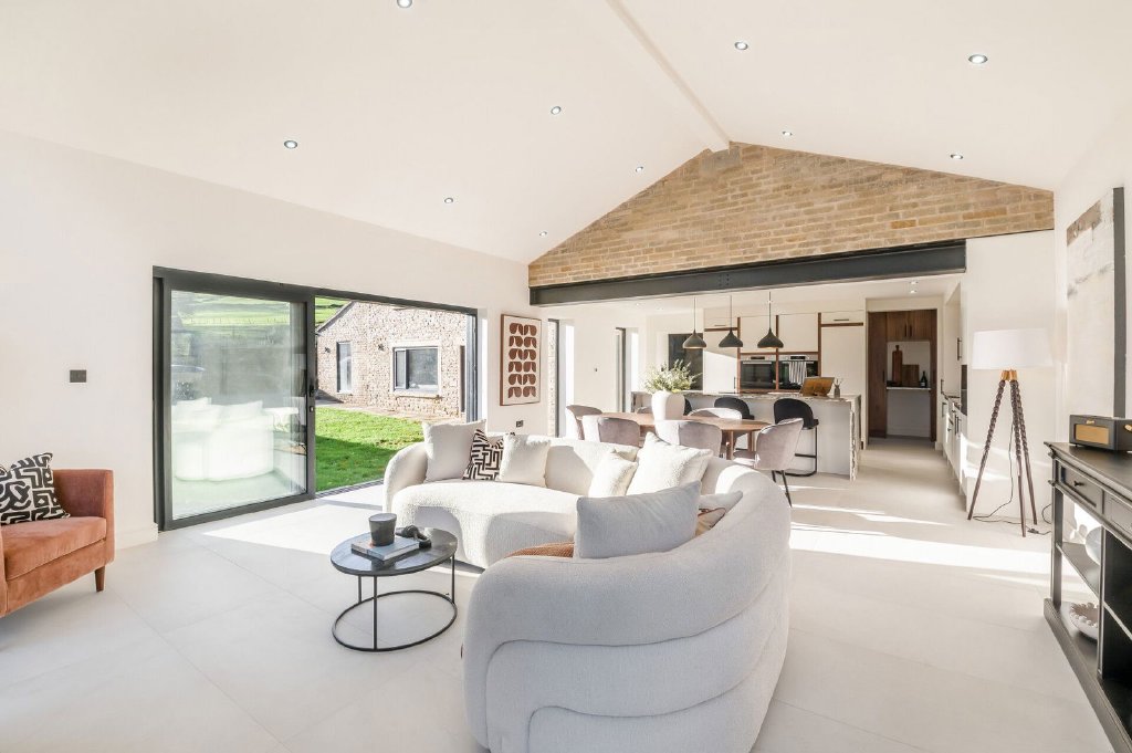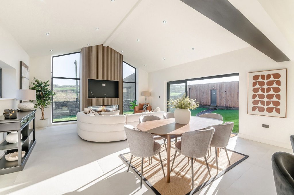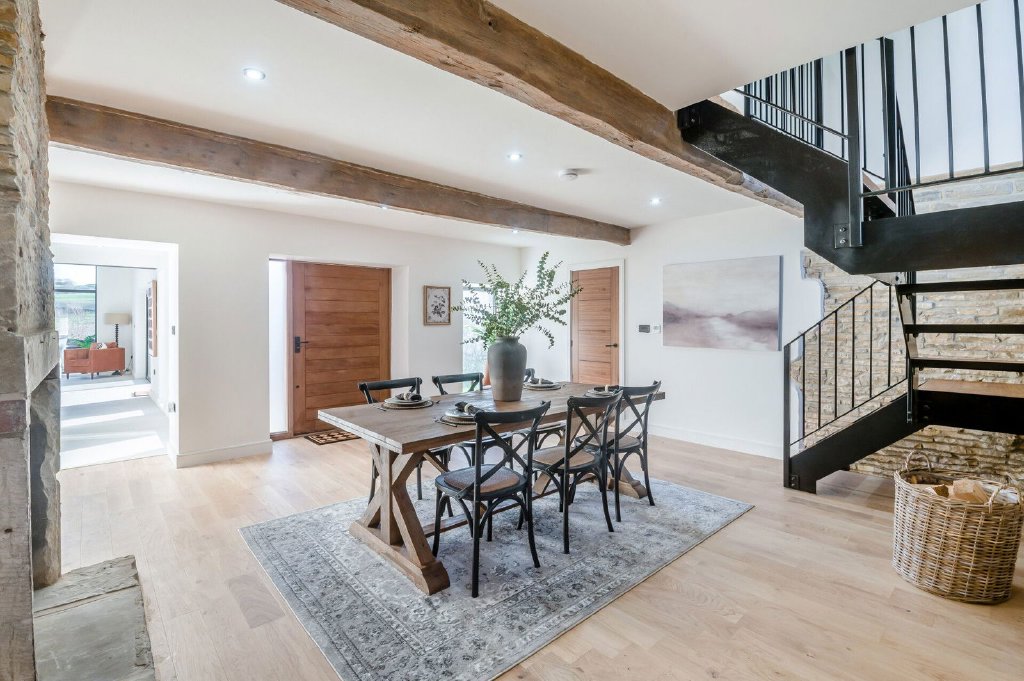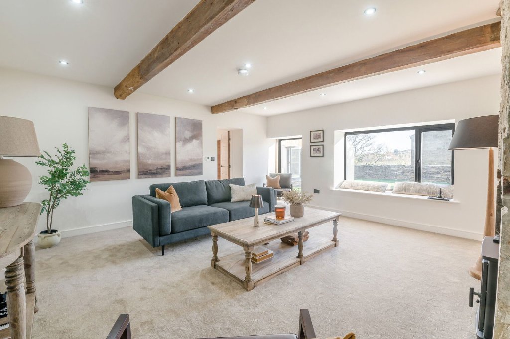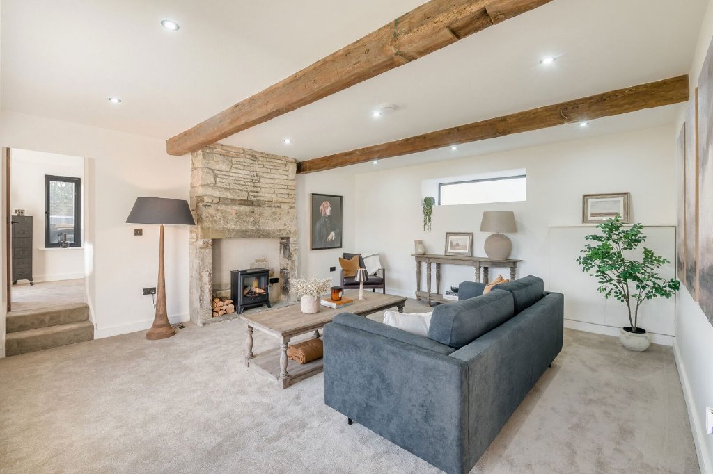 A bespoke oak door opens into the dining hall which immediately sets the scene; a stunning room offering generous accommodation with retained features on display including exposed beams to the ceiling, stonework to three walls and an original stone chimney breast which is home to a wood burning stove that sits on a stone flagged hearth. The room has an oak floor with underfloor heating, a bespoke staircase to the first-floor landing and windows to two aspects, the rear overlooking the gardens whilst offering a glimpse of surrounding scenery.
