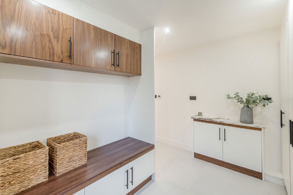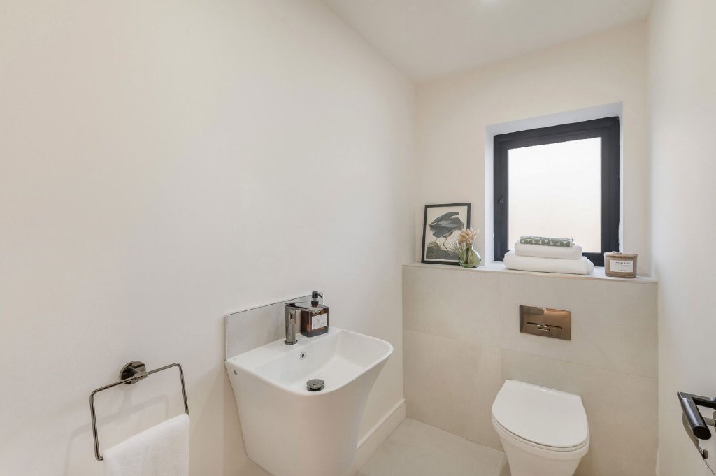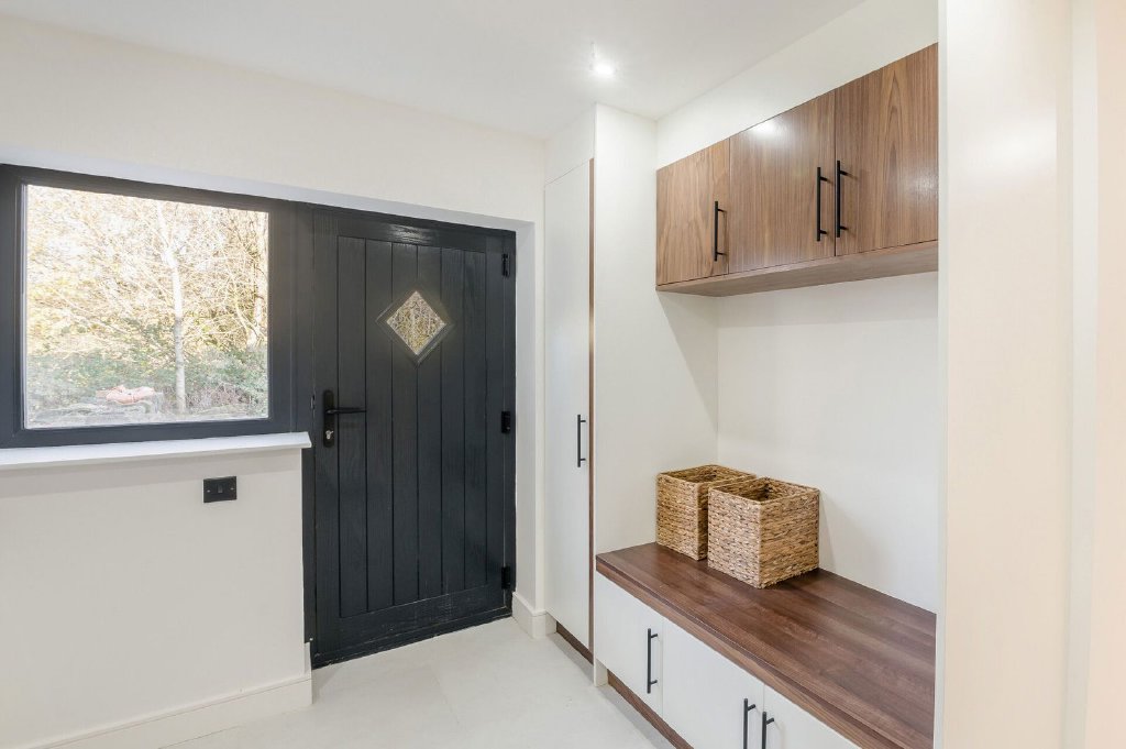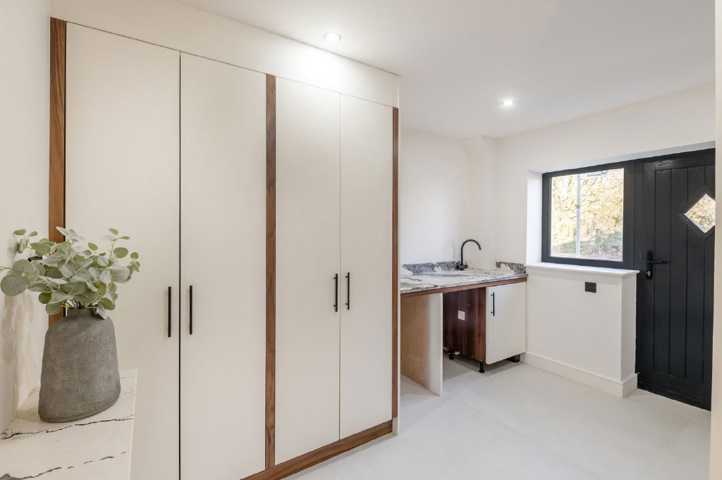 A boot room incorporates a utility, has a window and door to the side, full tiling to the floor with underfloor heating, furniture with granite worksurface incorporating a drainer and sink whilst having plumbing and space for an automatic washing machine and a dryer. There are useful cupboards and a bench with cupboards beneath and over. A cloaks room presents a modern two-piece suite.