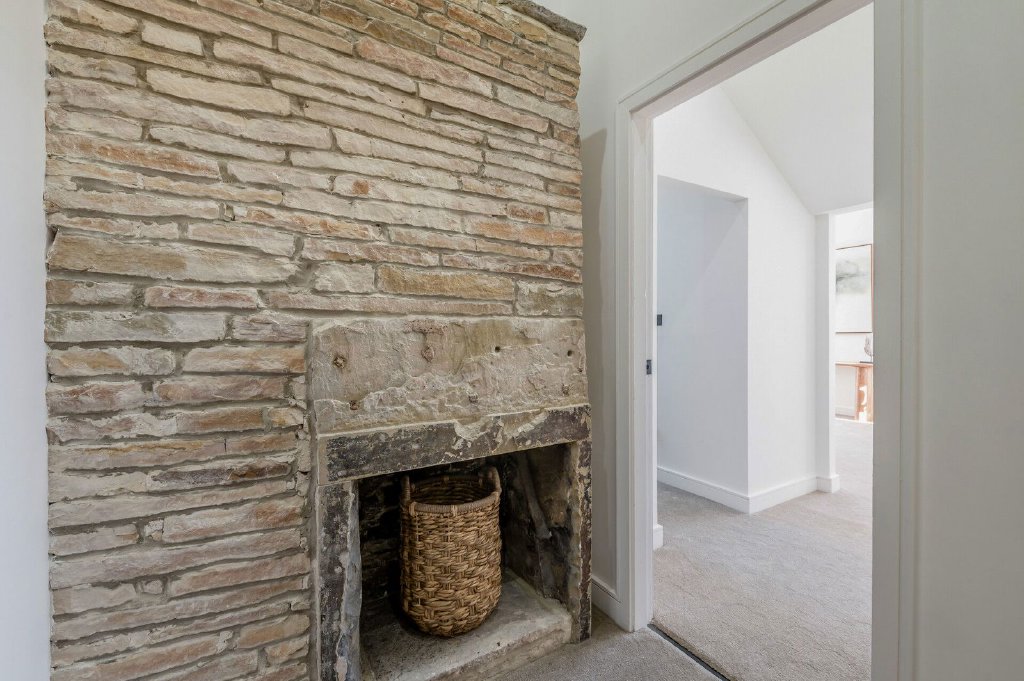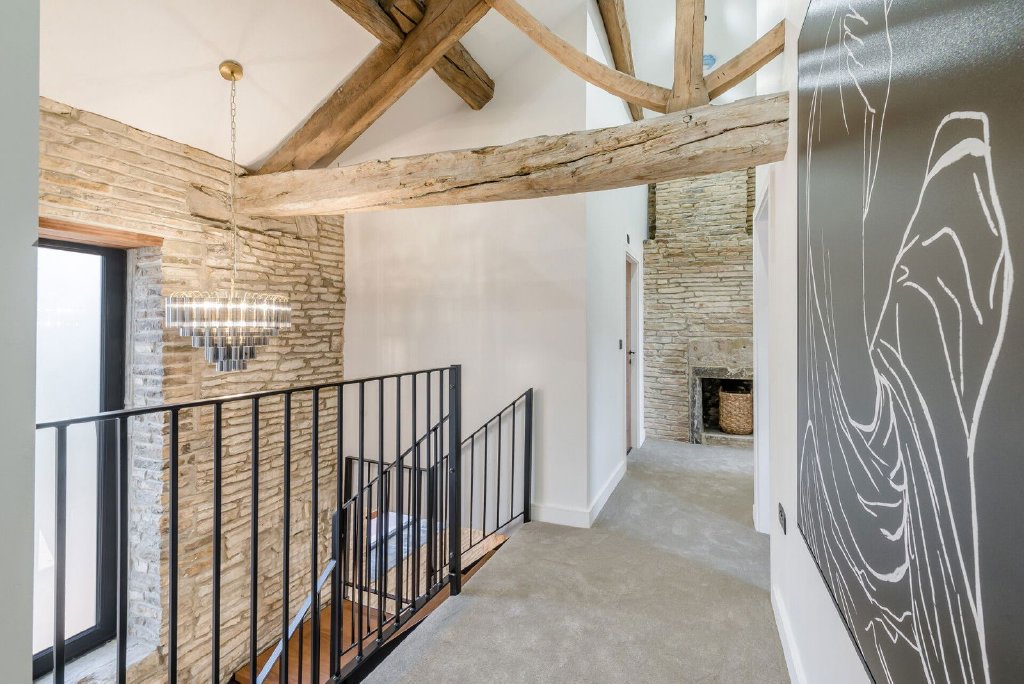 The landing overlooks the stairwell with an exposed stone wall, has a vaulted ceiling with exposed beams and timbers whilst a feature drop light finishes the look with a full height frosted window. An original stone chimney breast incorporates an original for place.
