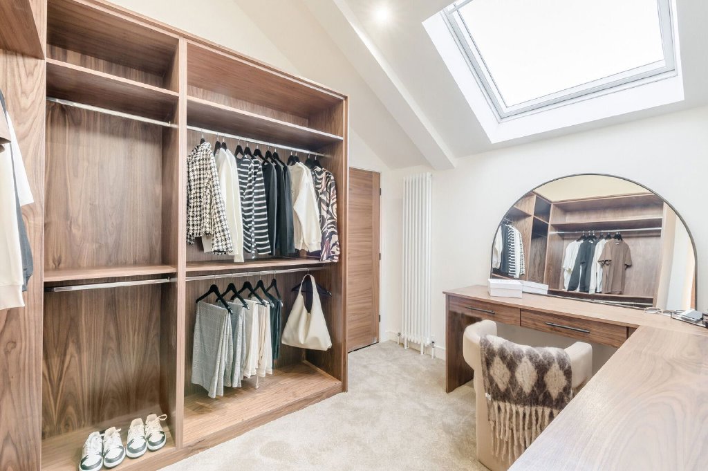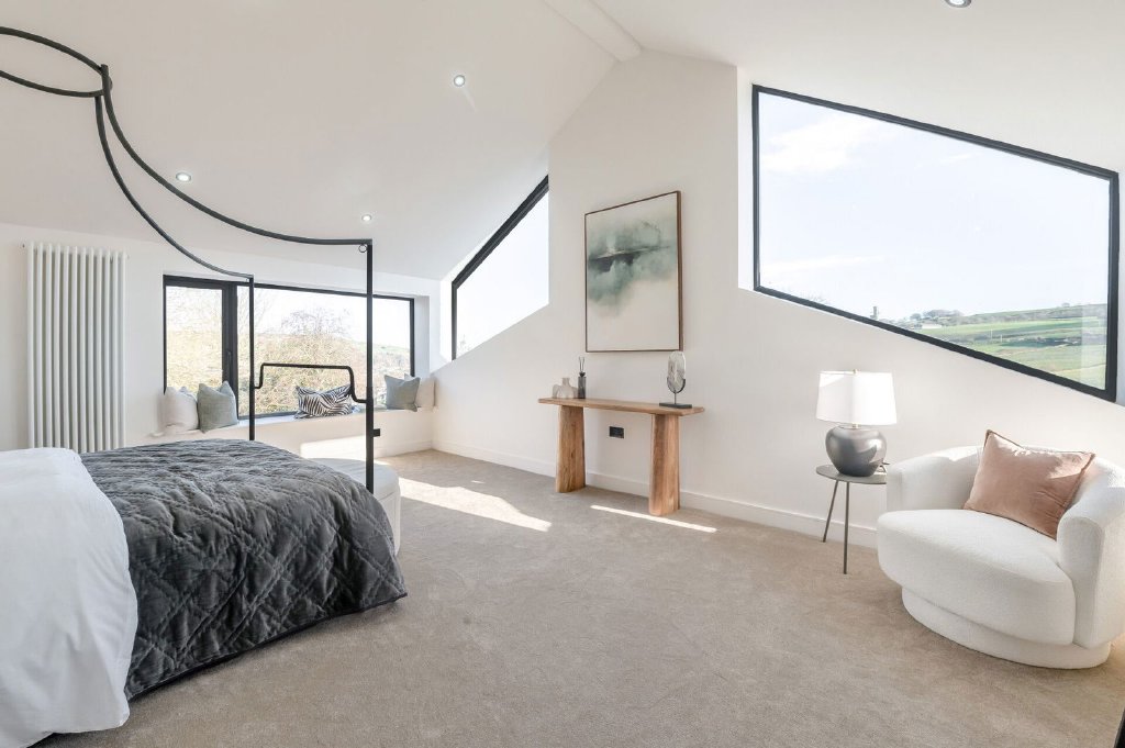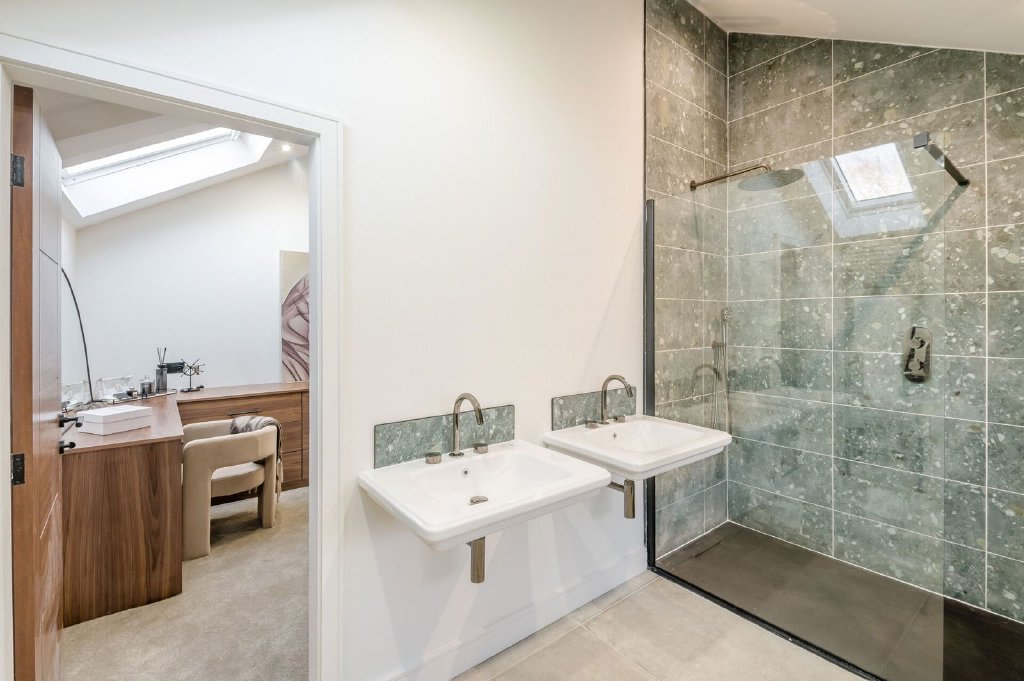 The principal bedroom suite is impressive from first view, the eye naturally drawn to angled windows ensuring natural light whilst also framing surrounding countryside. A vaulted ceiling results in a feeling of open space whilst a dressing room has open fronted wardrobes, drawer units and a dresser. The en-suite bathroom has complementary tiling to the walls and floor, a frosted window and furniture including a wall hung W.C, twin basins and a shower with a fixed glass screen.