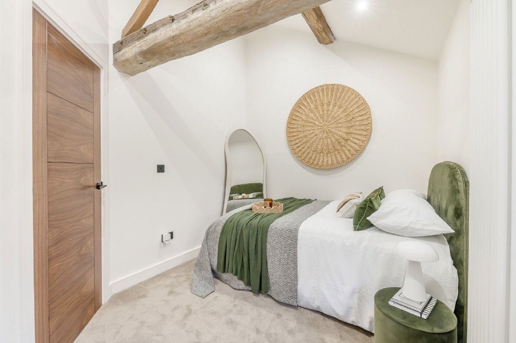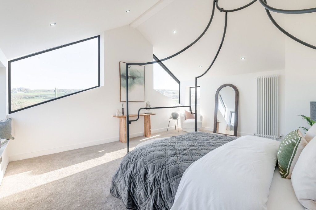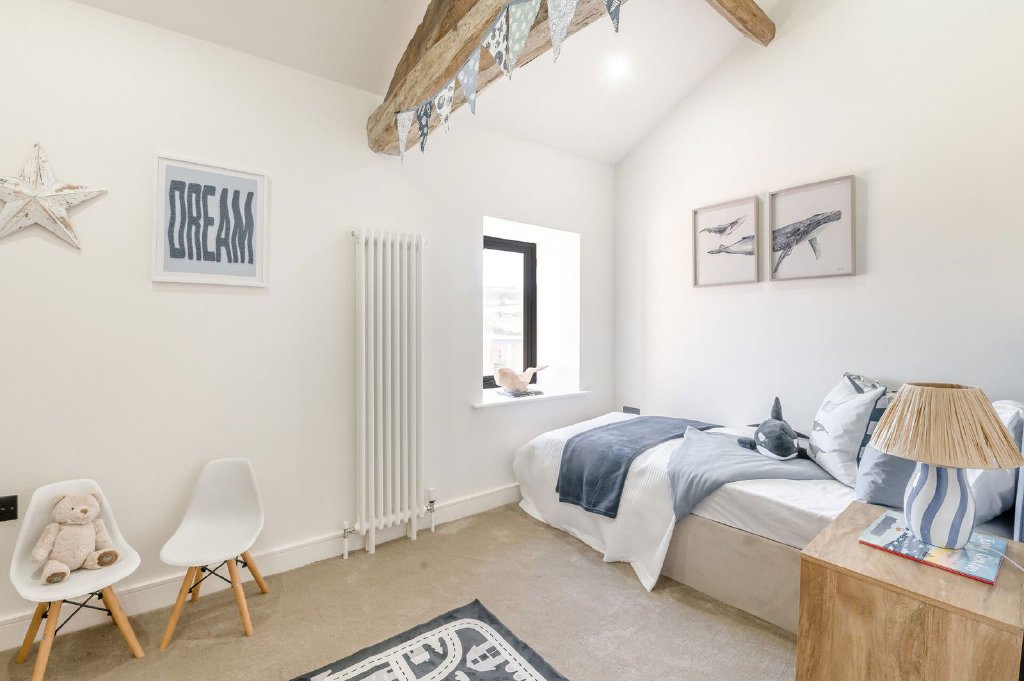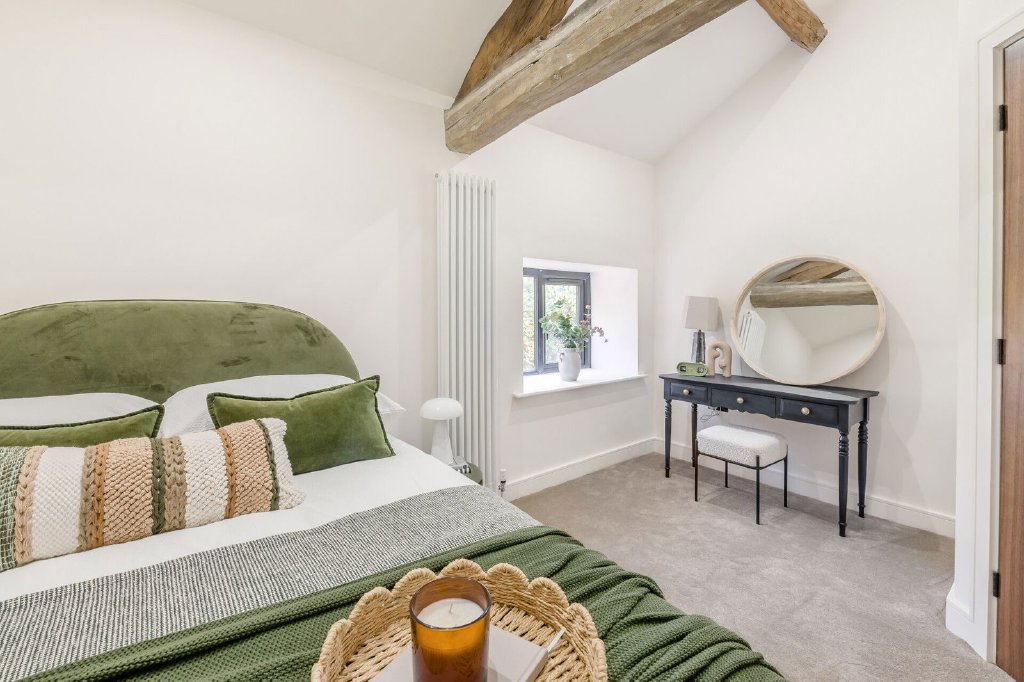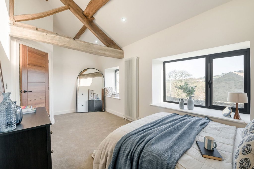 There are two additional bedrooms, to the first floor; a double with a vaulted ceiling, a window and exposed timbers whilst the fourth bedroom has exposed trusses and a window commanding stunning views.