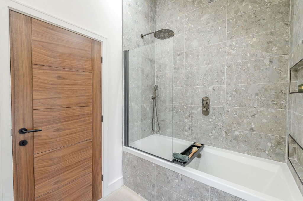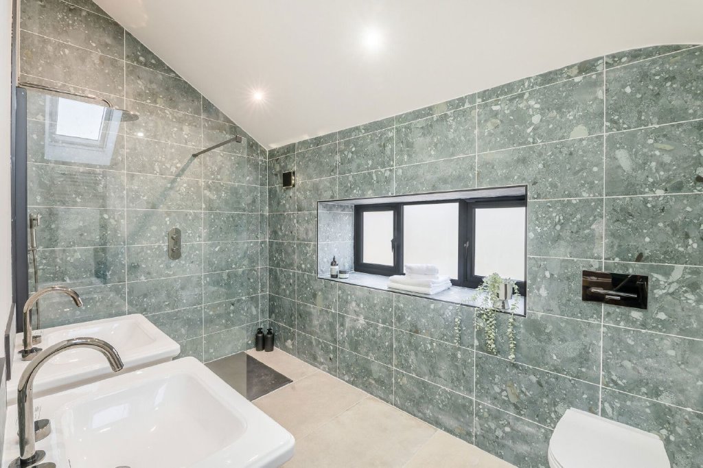 The family bathroom has a double ended bath with shower over, a wall hung W.C and a wash hand basin; feature tiling to the walls and floor, a frosted window and an exposed beam to a vaulted ceiling.
