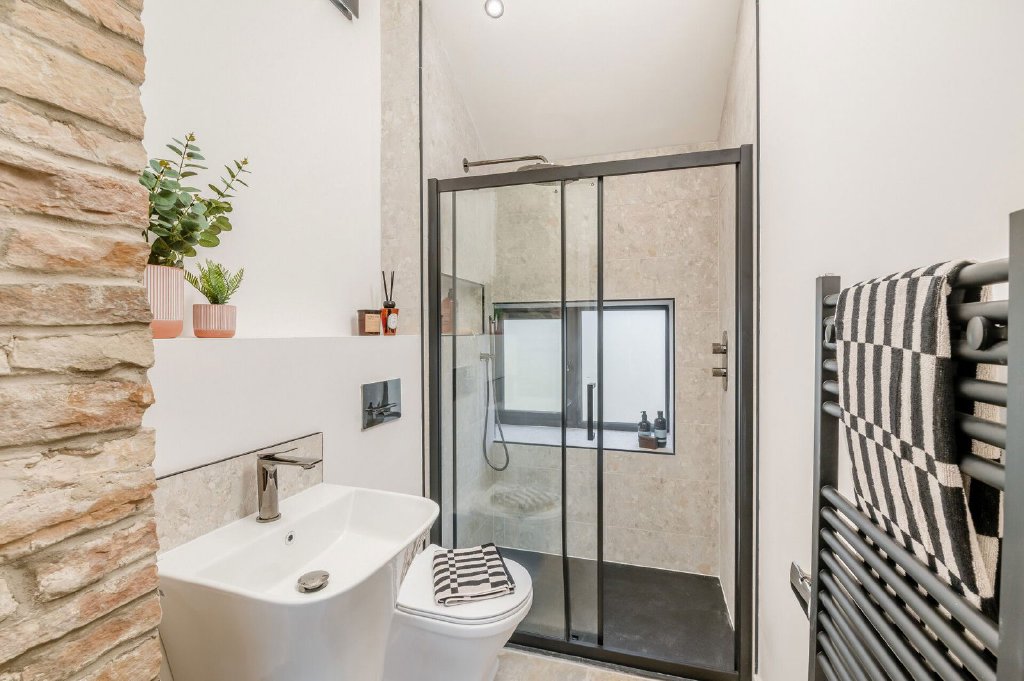 The living kitchen is undoubtedly the hub of the home; a show stopping room flooded with natural light, capturing stunning views of the surrounding landscape whilst incorporating the kitchen, dining area and sitting area. The room has full tiling to the floor with underfloor heating, a bank of sliding doors, seamlessly connecting to the garden, a vaulted ceiling with an exposed steel beam and original stonework. To the sitting area a media wall incorporates an electric fire, the kitchen benefitting from a comprehensive range of furniture complemented by granite surfaces and an island which extends to an overhanging breakfast bar with inset hob and down draft extractor. There is a Belfast double sink and full complement of appliances including twin ovens and grill, a full height fridge and a full height fridge freezer, a microwave oven and dishwasher.