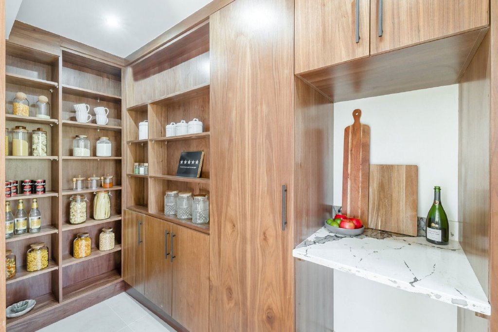 The adjoining pantry has a continuation of the tiled floor, a window and furniture including cupboards, open fronted shelving and a granite workstation.