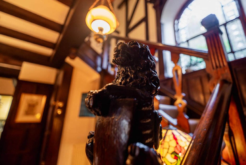 - Magnificent turning staircase with carved heraldic finials