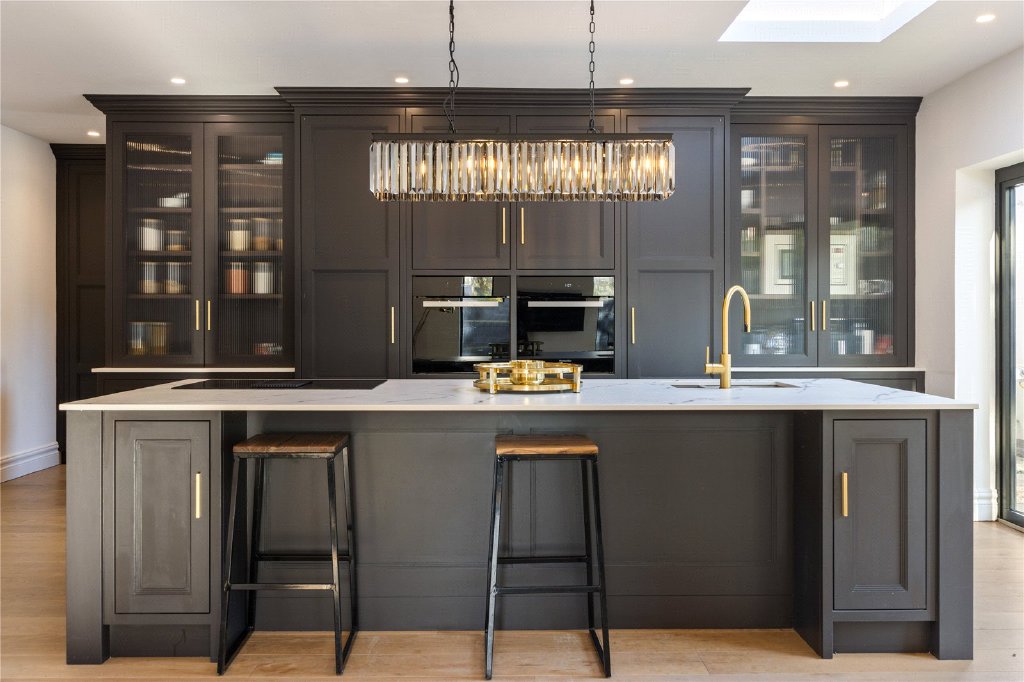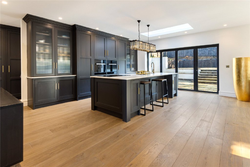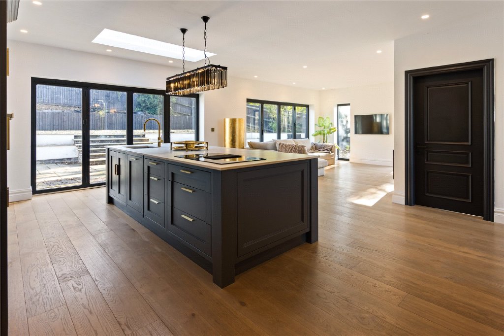 - Spacious open plan living kitchen with stylish shaker units and quartz surfaces