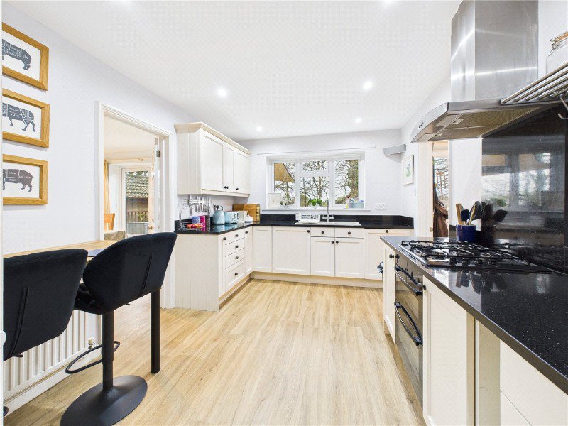 The kitchen is generously sized and enjoys a pleasant rear aspect overlooking the garden. It is well equipped with a comprehensive range of fitted units, ample worktop space and a breakfast bar. Adjoining the kitchen is a practical utility room, offering additional storage, with a door leading out to the garden and an internal door providing direct access to the integral single garage.