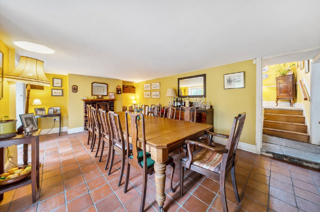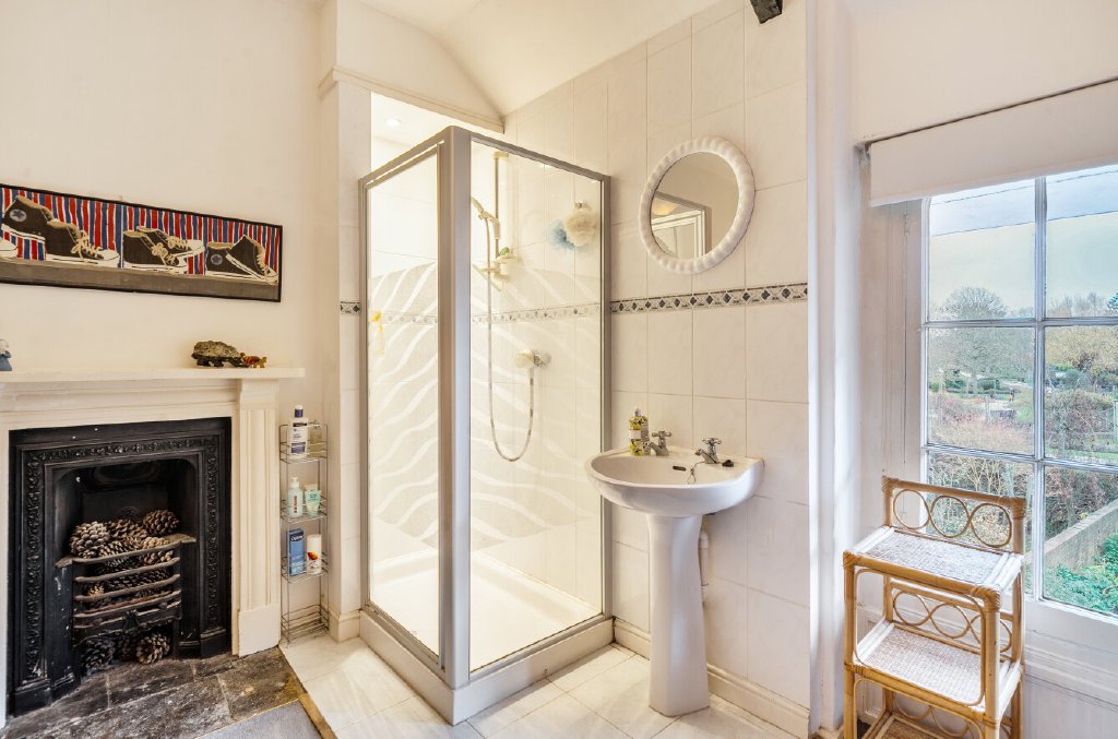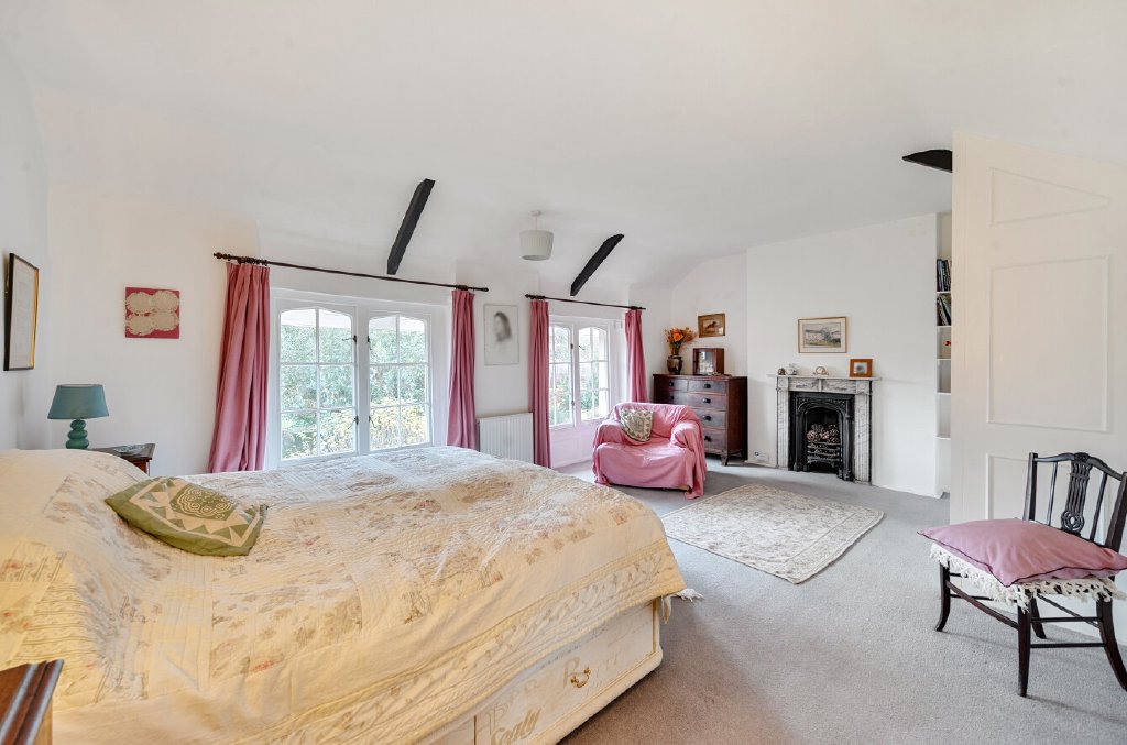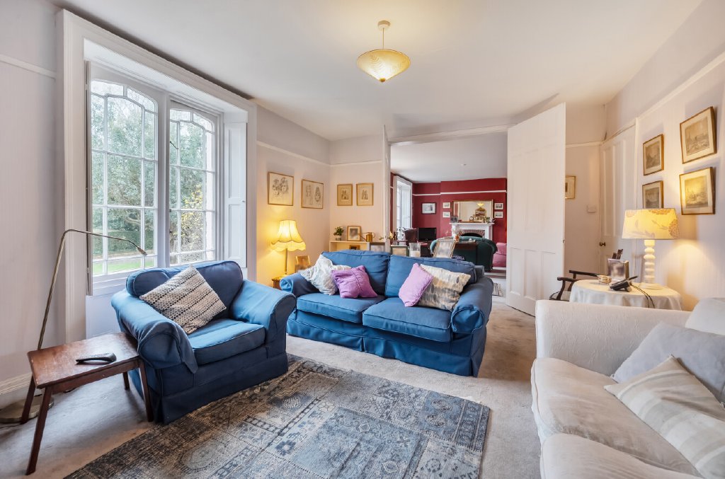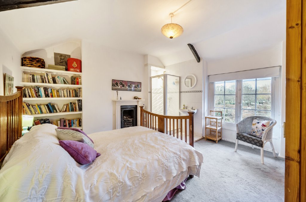 Designed with entertaining in mind, the drawing room and sitting room are linked by elegant double doors, allowing the spaces to be used separately or opened up to create a wonderful open-plan setting for gatherings. Large windows frame views over the gardens, filling both rooms with natural light, while two open fireplaces offer a warm and atmospheric focal point. A double bedroom with an en-suite shower room offers flexible space, ideal for visiting guests, older children or multigenerational living.