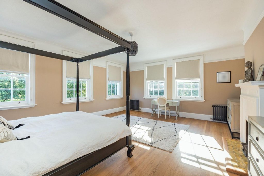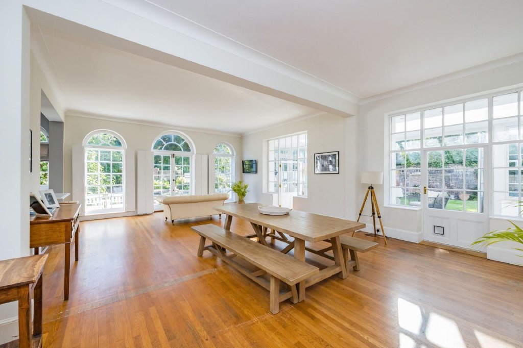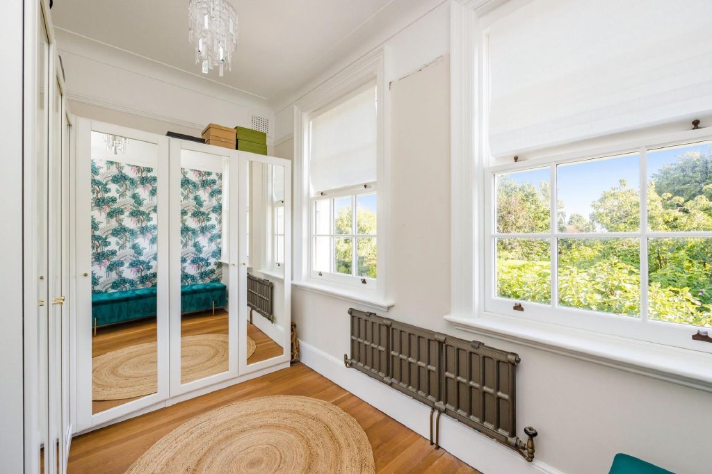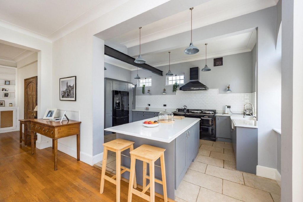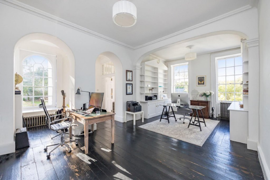 The ground floor spans 2,433 sq ft and brings together the building’s heritage and modern comfort. High ceilings and grand arched windows enhance the period feel while the luxury inbuilt appliances in the kitchen provide every modern convenience. Entry is through a vestibule where boots and coats can be kept out of sight. This leads into a welcoming library with dark wooden floors and soft neutral walls that continue throughout the house. The heart of the home is the open plan kitchen, dining and lounge area which has been thoughtfully opened to create a spacious family environment. The kitchen sits semi open to the side so that preparing meals remains part of family life. From here there is access to the west facing heritage orangery, carefully reconstructed to honour the 1920s conservatory is a family favourite spot. Filled with natural light from the full-length roof lantern and bifold doors, the orangery offers a lovely connection to the surrounding garden.