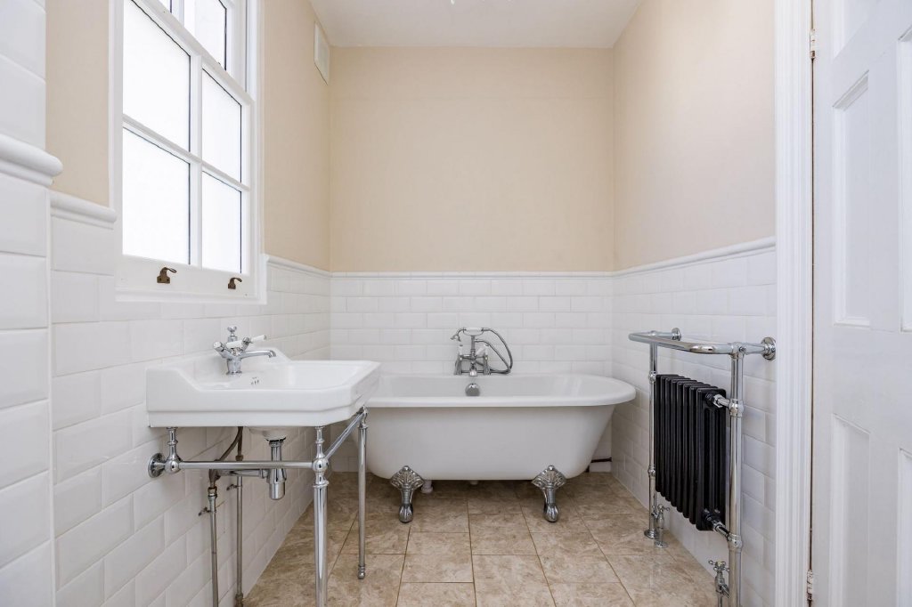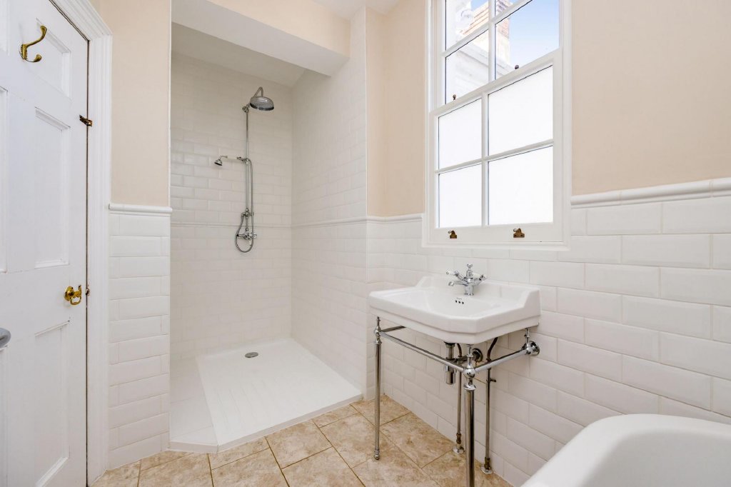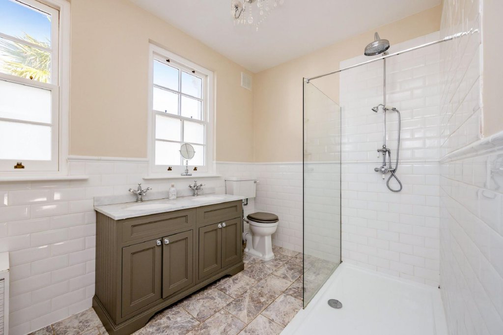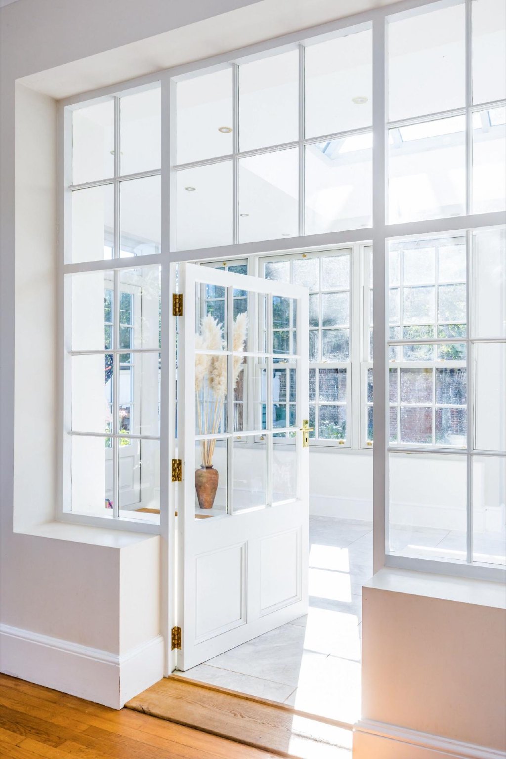 The ground floor spans 2,433 sq ft and brings together the building’s heritage and modern comfort. High ceilings and grand arched windows enhance the period feel while the luxury inbuilt appliances in the kitchen provide every modern convenience. Entry is through a vestibule where boots and coats can be kept out of sight. This leads into a welcoming library with dark wooden floors and soft neutral walls that continue throughout the house. The heart of the home is the open plan kitchen, dining and lounge area which has been thoughtfully opened to create a spacious family environment. The kitchen sits semi open to the side so that preparing meals remains part of family life. From here there is access to the west facing heritage orangery, carefully reconstructed to honour the 1920s conservatory is a family favourite spot. Filled with natural light from the full-length roof lantern and bifold doors, the orangery offers a lovely connection to the surrounding garden.