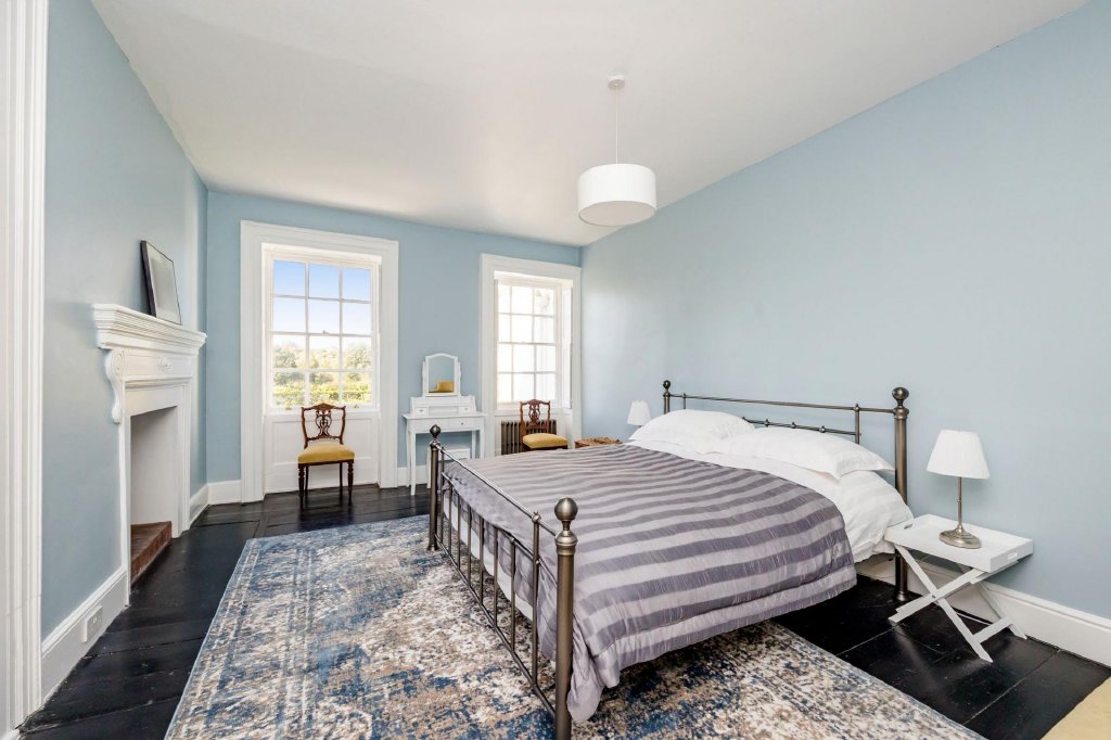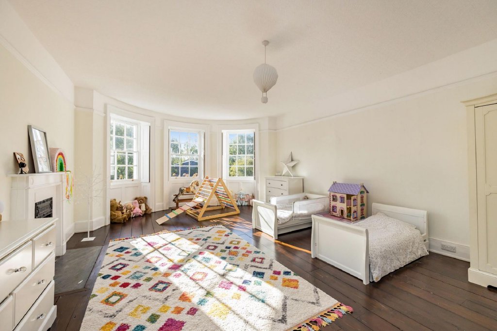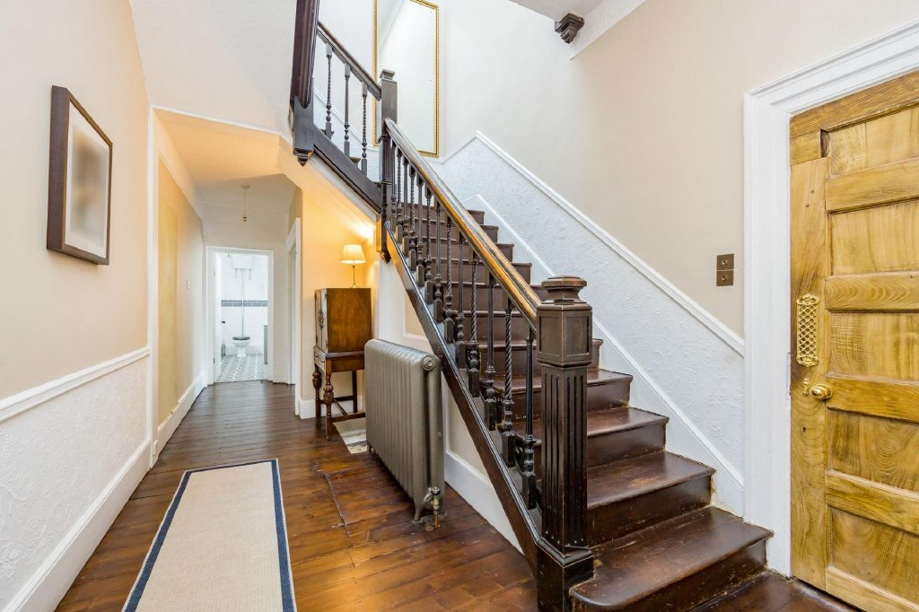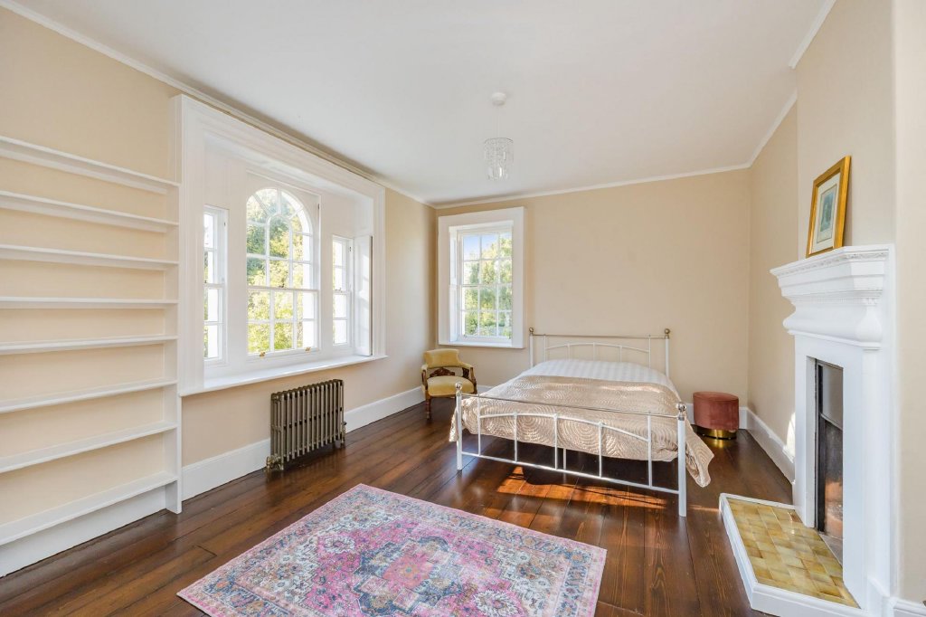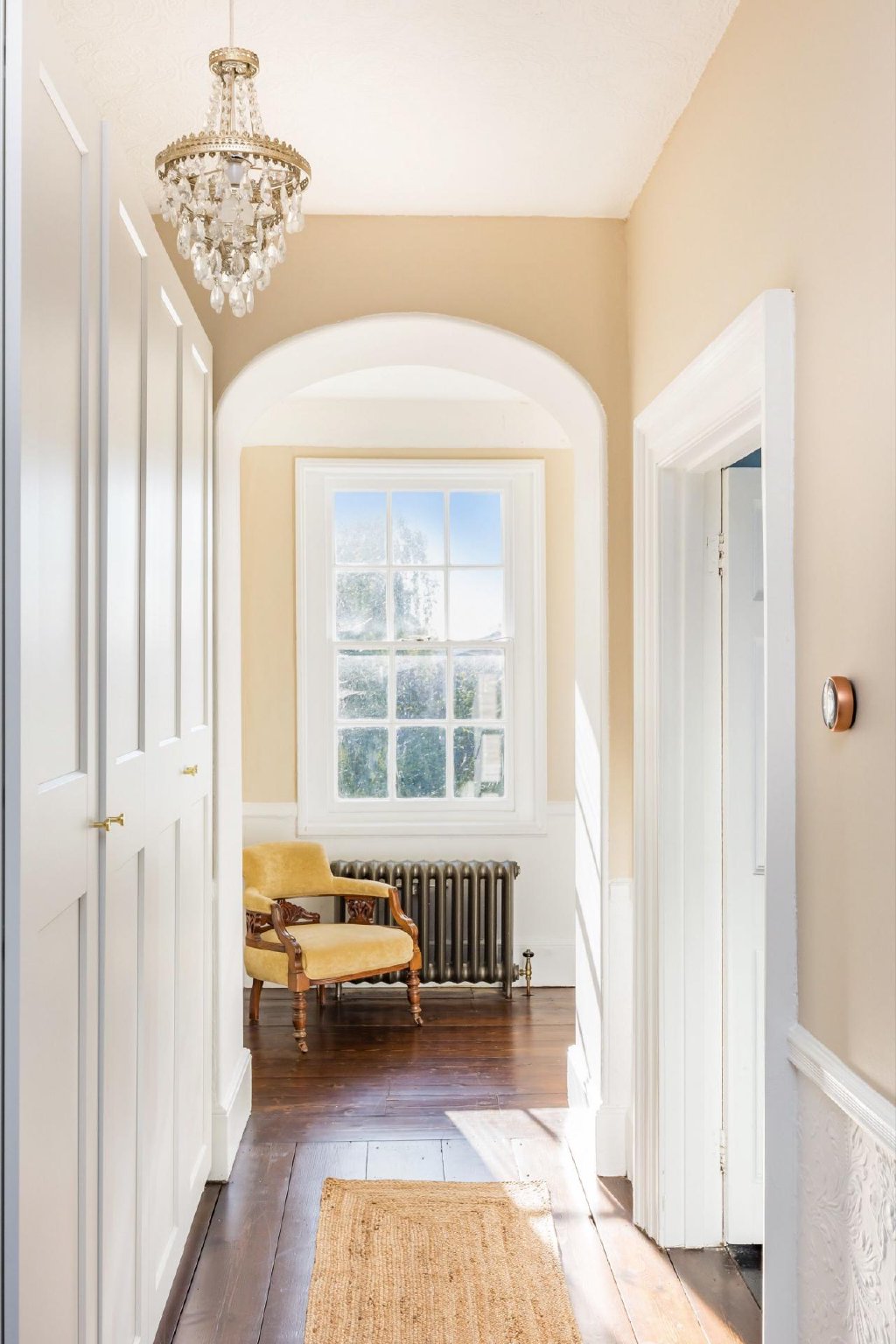 A dark wooden staircase, lit by the lantern above, rises to the first floor where the hallway links six bedrooms, two family bathrooms and an additional cloakroom. The Georgian grandeur of the ground floor continues here, reflected in the bow window of the largest bedroom and the Venetian window along the landing.