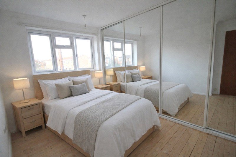 11’6 x 10’2 (including wardrobe recess) another double bedroom with UPVC window to the front aspect, fitted twin double wardrobes with glass sliding doors and hanging rails, power points and stripped wood floor.