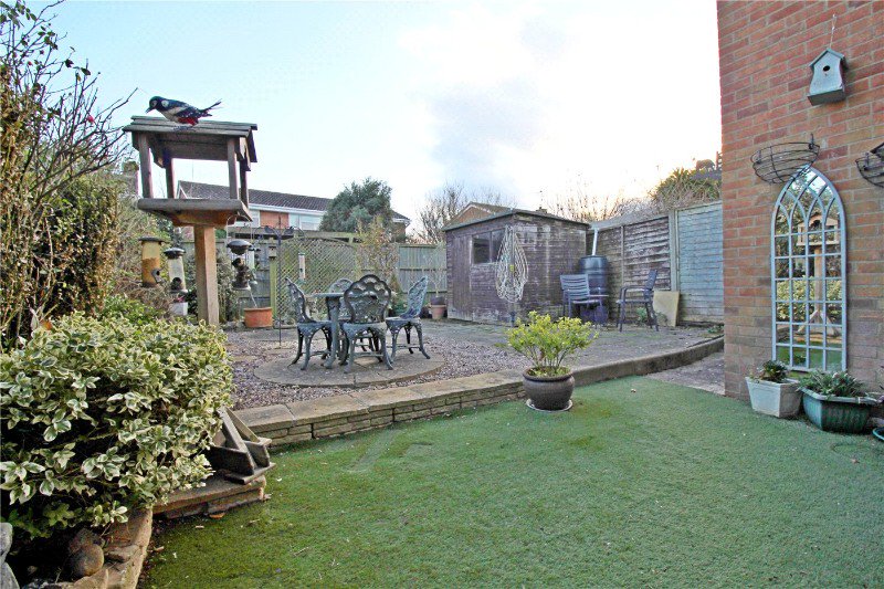 Well located within a popular established development close to open parkland, amenities and local primary schools, the frontage is open with neat lawn and gravel driveway offering off road parking, timber gated side access leads to the rear gardens which are mainly enclosed by panel fencing and enjoy a southerly facing aspect, split level with artificial lawns and raised patio seating and granite chipped beds, shrub borders and timber shed.