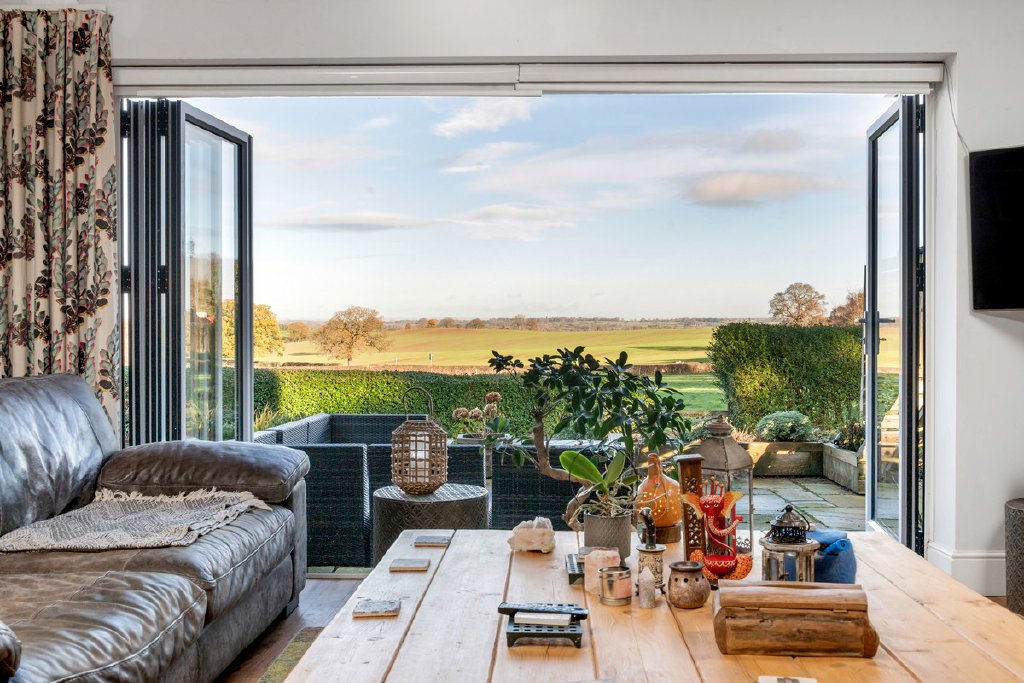 The dining area links effortlessly with the kitchen and the adjoining lounge space, which provides a relaxed seating area enjoying fantastic, far reaching countryside views and further bi-fold doors opening to an additional patio area. A utility room sits off the dining area, while a ground floor WC is accessed from the reception hall, completing the ground floor accommodation.