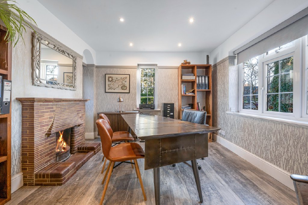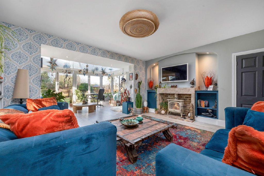 To the left of the reception hall is a versatile triple-aspect room, currently used as a home office, though equally well suited as a snug or playroom. Also on the left-hand side is the principal sitting room, an impressive space arranged into two distinct zones. The main sitting area benefits from a bay window to the side aspect, a central fireplace with inset log burner and a stone surround and mantel, flanked by alcove display shelving. This room flows seamlessly into the orangery, a beautiful, fully glazed reception room with roof lantern and bi-fold doors opening onto the garden, offering wonderful views out and an abundance of natural light.