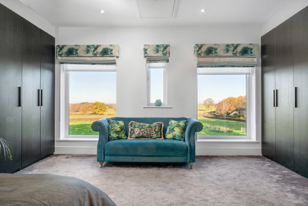 Stairs ascend from the reception hall, to a bright, spacious landing and onto the extent of the accommodation at first floor level. The principal bedroom is a particularly impressive suite, spanning the full depth of the property and enjoying superb far-reaching countryside views, particularly towards the north-east. The principal bedroom incorporates a walk-through dressing area, a generous bedroom with two banks of fitted wardrobes, and a large en-suite bathroom. The modern, fully tiled en-suite is fitted with a dual vanity wash basin with backlit LED mirrors, low-level WC, fitted bath with shower attachment, and a sauna.