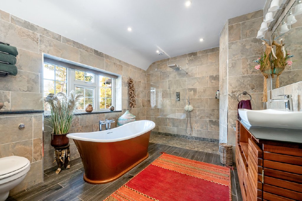 A contemporary family bathroom serves the remaining bedrooms and is fully tiled, featuring a freestanding bath, a large dual sided shower enclosure, wall-mounted WC and vanity wash basin. A separate WC sits adjacent to the family bathroom.