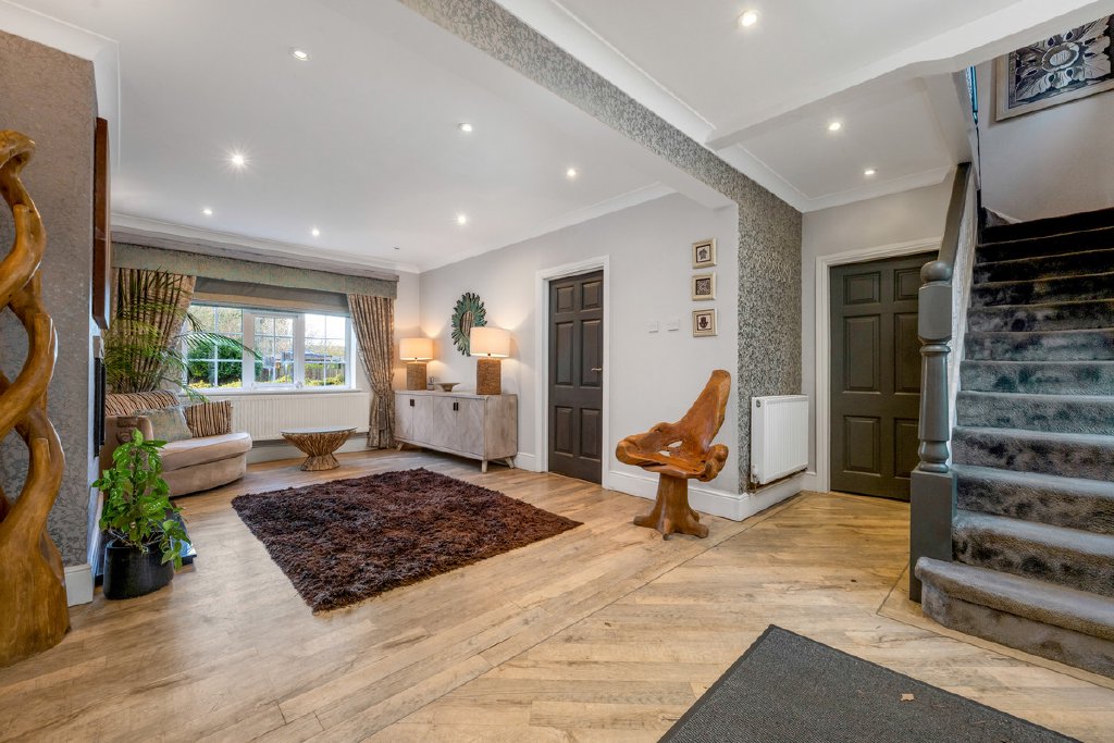 The front entrance opens into a statement reception hall extending the full depth of the property. Bathed in natural light from its dual aspect and centred around a log burner, this luxurious space sets an immediate sense of quality and elegance for the accommodation to follow.