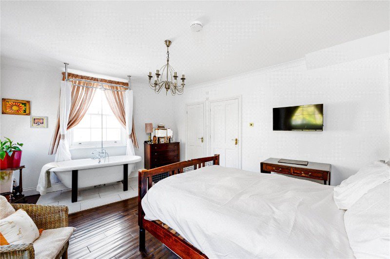 On the first floor, the magnificent master bedroom enjoys a dual aspect views and features a charming freestanding bath. An en-suite WC/cloakroom is accessible from here. Another dual aspect bedroom to the rear boasts its own en-suite shower room.