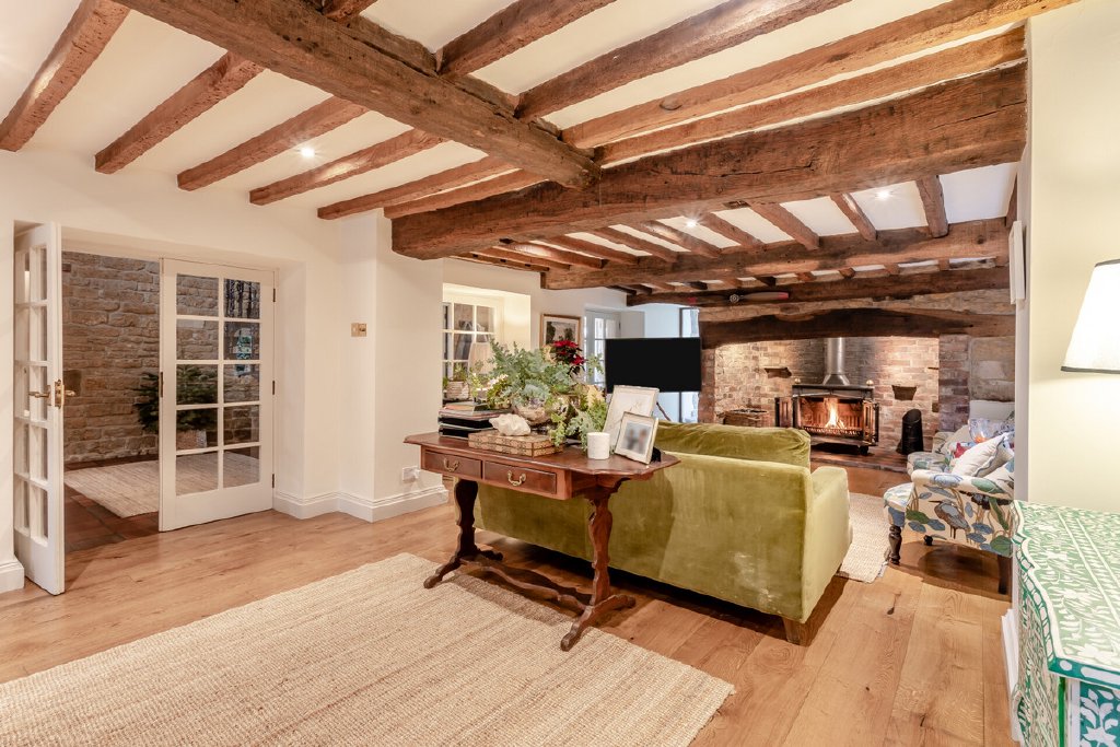 On entering you are greeted by a beautiful reception hallway with a slate floor, period fireplace, beams and an oak panelled wall and staircase to upper floor, there is also access to the rear terrace and the cellar. On the left of the reception hall is a lovely sitting room again with period features including a fireplace with wood burner, polished floorboards, exposed stone wall, window shutters and a charming Georgian corner cupboard, French doors open onto the terrace. The kitchen/breakfast room is a large family space fitted with a range of country style oak units with granite worktops, a pillar box red Aga with warming plate, hob and extractor, pantry and plumbing for a dishwasher and washing machine. The breakfast area is to the front of the house with an open fireplace and window top the front with shutters. Leading off the kitchen is a vast double-height hallway with a spiral staircase to the upper floor and a guest cloakroom, this superb space links the main house to the older part of the house which was originally a separate cottage dating back to the 1600s and forms the main reception room which is crammed with period features including beams and an amazing inglenook fireplace with original bread over and a wood burner. To the rear of the hallway is a boot room with utility and gym area.