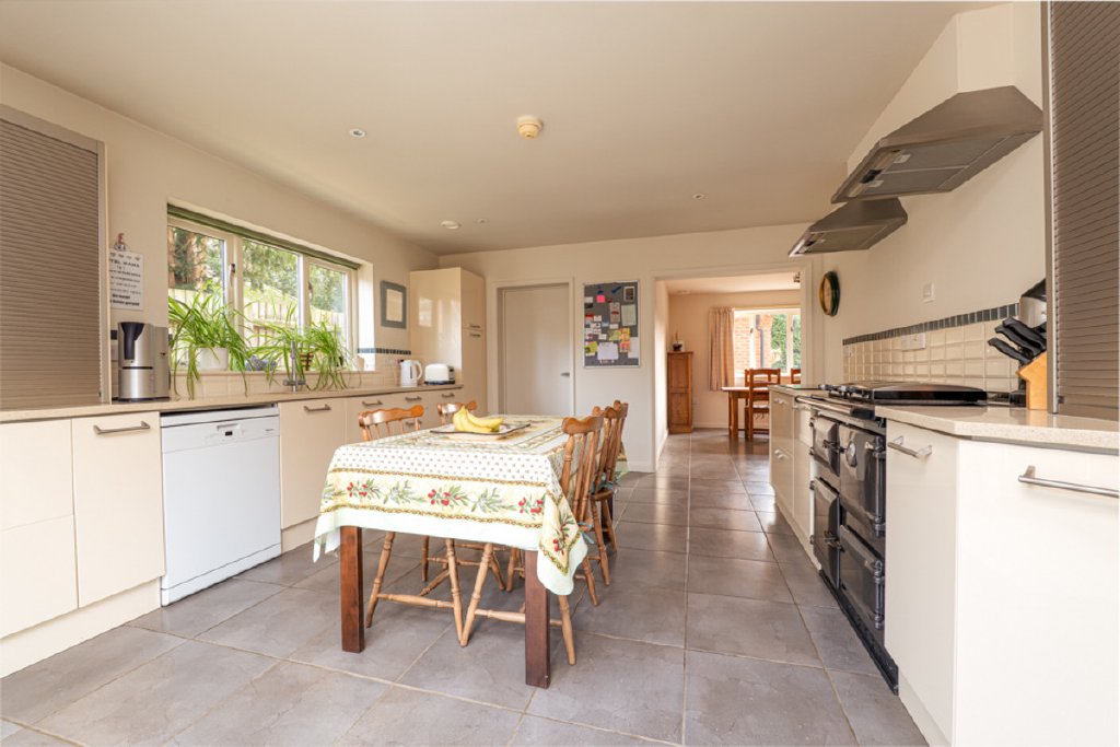 The property is entered through an entrance porch from which double doors open into a large, double height entrance hall with feature staircase. The hallway flows seamlessly into a generous dining area and kitchen with double doors to garden. The kitchen cabinets wrap around a central dining area integrated appliance to include a range style cooker with back boiler. Adjoining the kitchen is a fully equipped utility room with door to garden. The sitting room with dual aspect has a cosy log burner and door to garden. Bedroom three and adjacent bathroom with separate shower located on the ground floor offer flexibility, suitable as a guest room, home office, or snug retreat.