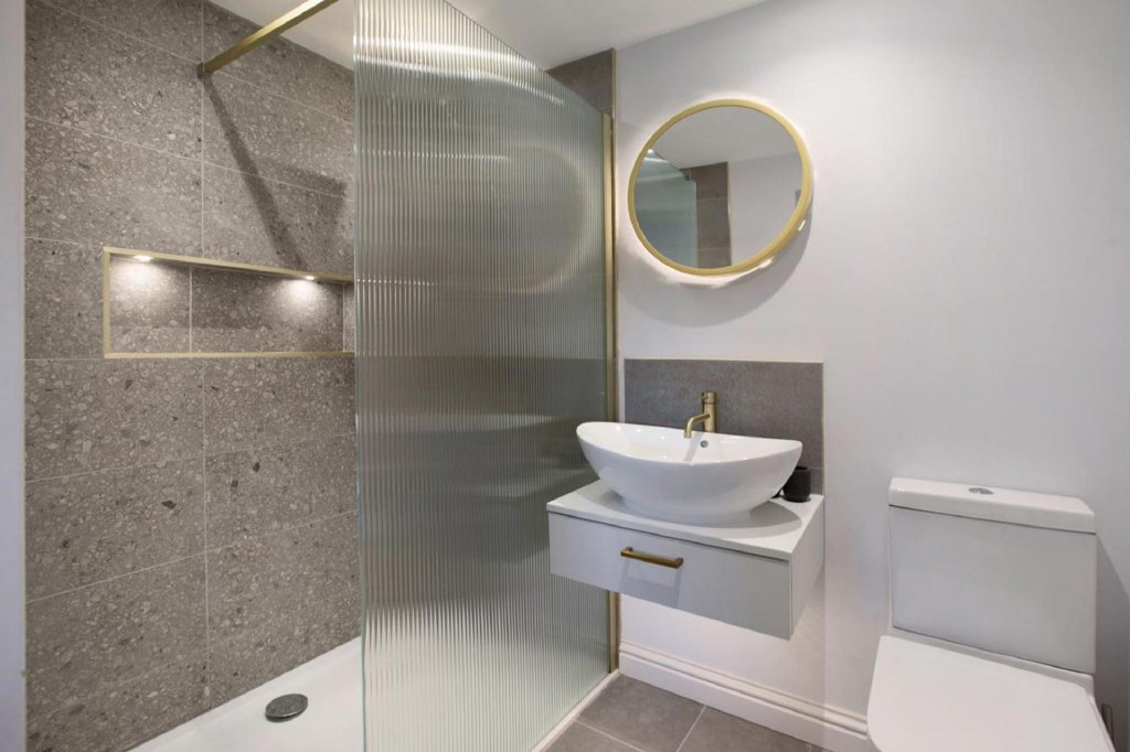 A study area leads to two double bedrooms, one with an en-suite and access to the garden, offering excellent self contained guest accommodation or ideal quarters for older children or relatives. A stylish family shower room, well-placed utility room, and internal access to the garage enhance the practicality of the home.