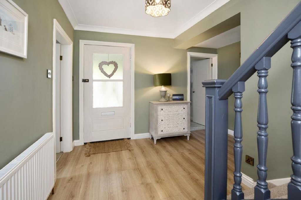 The main entrance opens into a bright and spacious hallway, creating an immediate sense of calm and welcome. To the right, a generous sitting room flows into the garden room—perfect for reading, entertaining, or enjoying the ever-changing light throughout the day.