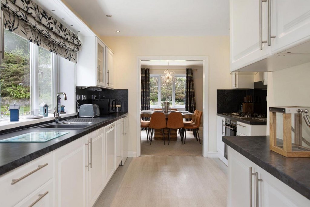 At the heart of the home lies a beautifully proportioned kitchen—both stylish and functional—designed to serve as a central hub for daily life and entertaining alike. Sleek black countertops contrast elegantly with crisp white cabinetry, offering a timeless aesthetic and generous preparation space. A window overlooking the garden bathes the room in natural light. Thoughtfully laid out with a full suite of integrated appliances and plentiful storage, the kitchen flows seamlessly into the adjoining dining room, creating an effortless sense of connection for family gatherings or hosting guests. Engineered wood-effect flooring underfoot enhances the warm and welcoming atmosphere, while recessed lighting completes the clean and contemporary look.