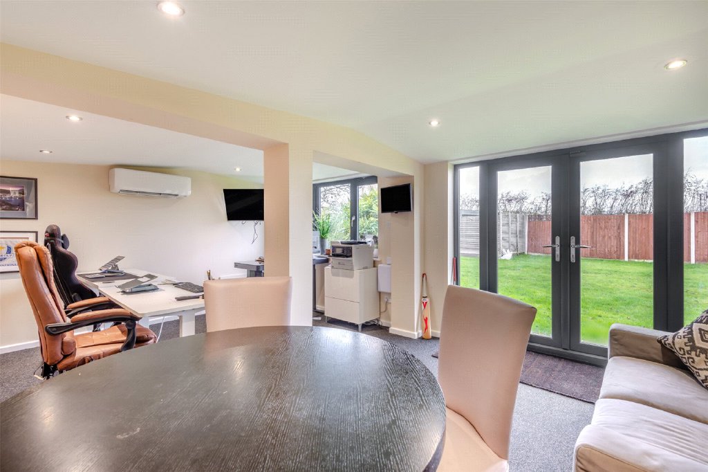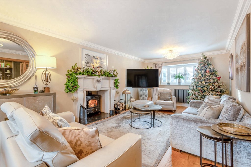 Internally, the accommodation flows beautifully, beginning with a welcoming entrance hall that sets the tone for the space and flexibility found throughout the house. The sitting room is positioned to the front and enjoys a feature fireplace with log burner, creating a cosy yet refined retreat, while bi-fold doors allow it to connect seamlessly with the rest of the ground floor when entertaining. A separate dining room, also to the front, offers a more formal setting with generous proportions and fitted storage, ideal for hosting family gatherings or dinner parties.
