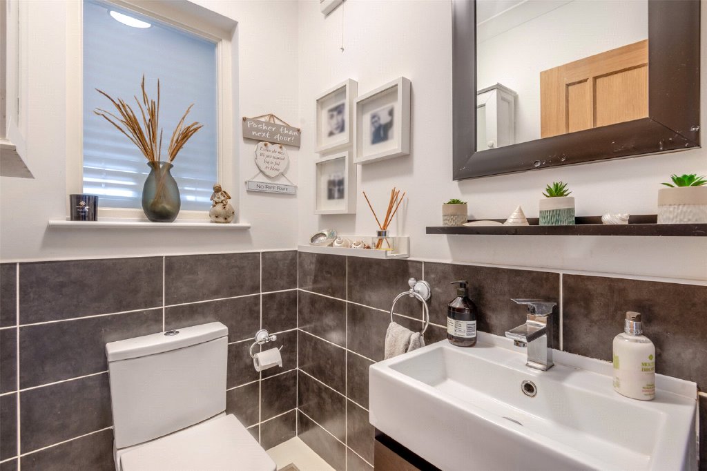 Cloakroom 5' x 3'11" (1.52m x 1.2m). Double glazed frosted window to front. Tilled flooring. Plain coved ceiling. Heated towel rail. Wash hand basin. Low level W.C.
