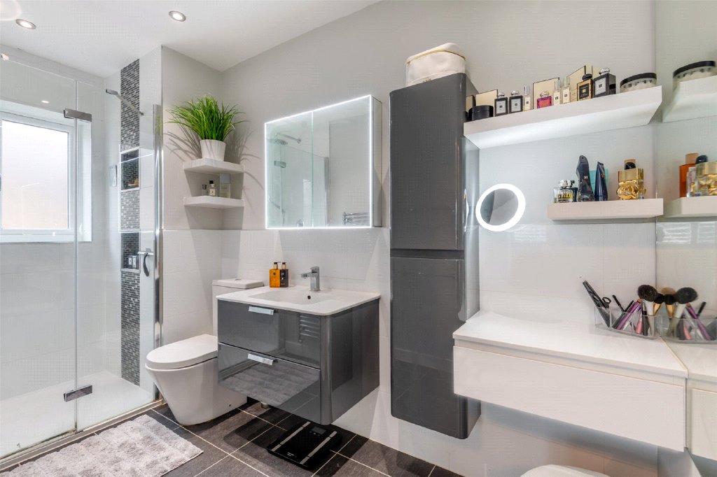 Family Bathroom 9'1" x 5'5" (2.77m x 1.65m). Double glazed frosted window to rear. Double Heated towel rail. Plain coved ceiling. Wash hand basin in vanity unit. Low level W.C. Round mirror. Upright cabinet.