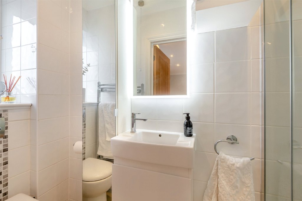 Ensuite Shower Room 8'7" x 2'11" (2.62m x 0.9m). Double glazed frosted window to rear. Plain coved ceiling. Downlighters. Wash hand basin. Low level W.C. Shower cubicle. Mirror light. Heated towel rail.