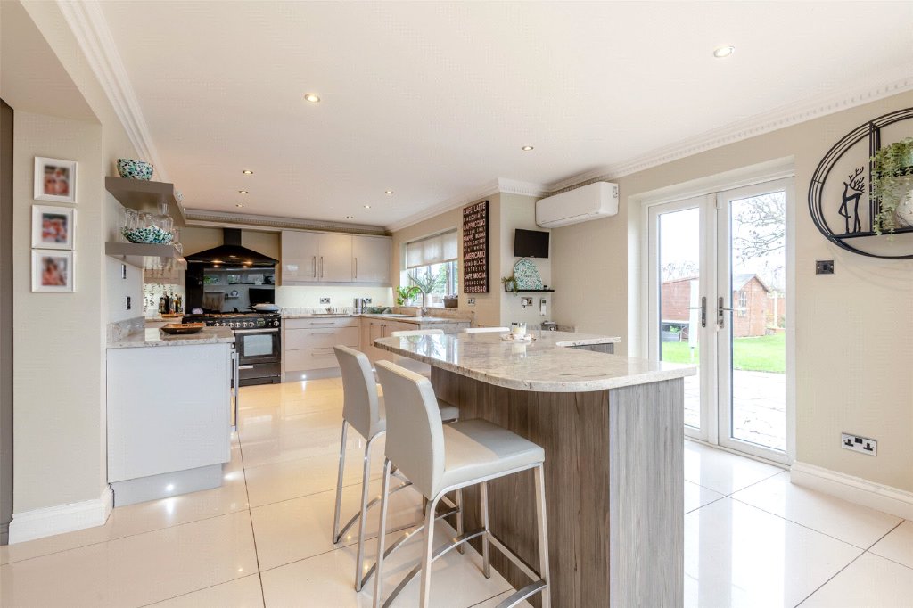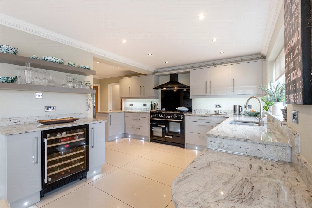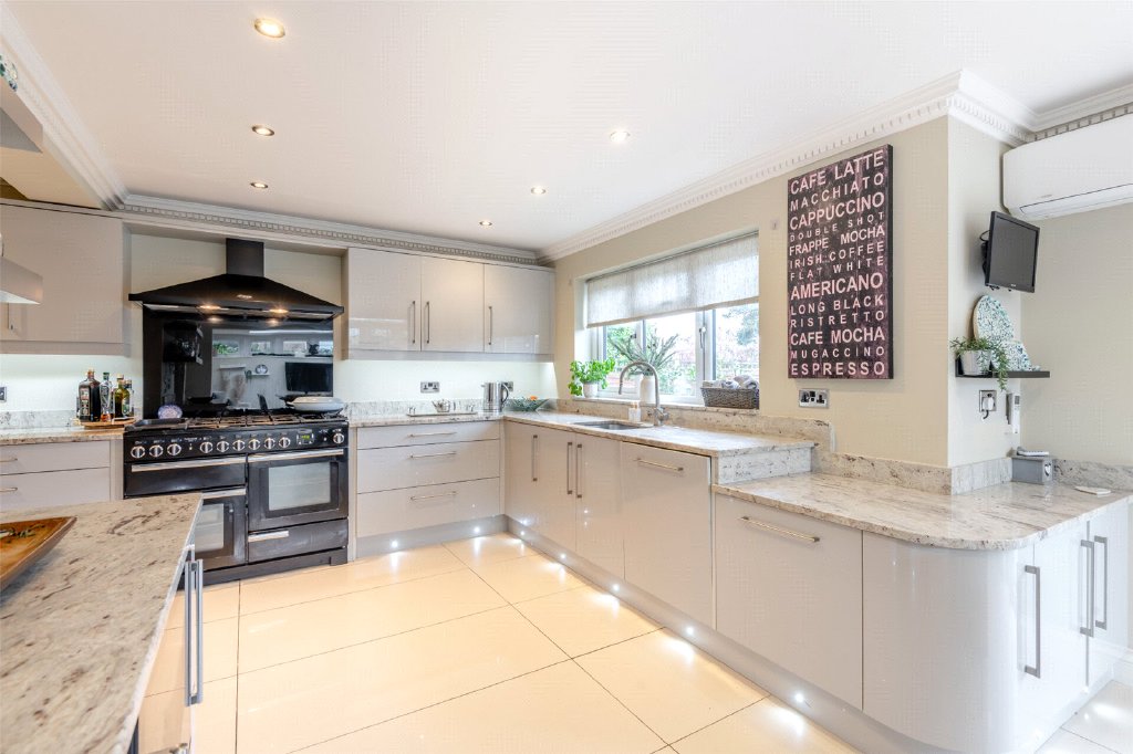 The heart of the home lies to the rear, where an impressive open-plan kitchen, breakfast and orangery-style family room has been created. This expansive space is flooded with natural light via roof lanterns, large windows and bi-fold doors opening directly onto the garden, blurring the line between inside and out. The kitchen itself is well appointed with extensive cabinetry, quality appliances and a substantial central island, making it a practical and sociable hub for everyday life. The adjoining family area provides ample space for relaxed seating and dining, while underfloor heating and air conditioning ensure year-round comfort. A separate utility room sits neatly off the kitchen, providing additional storage and practicality with its own external access.