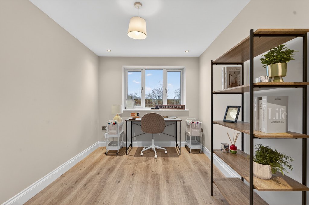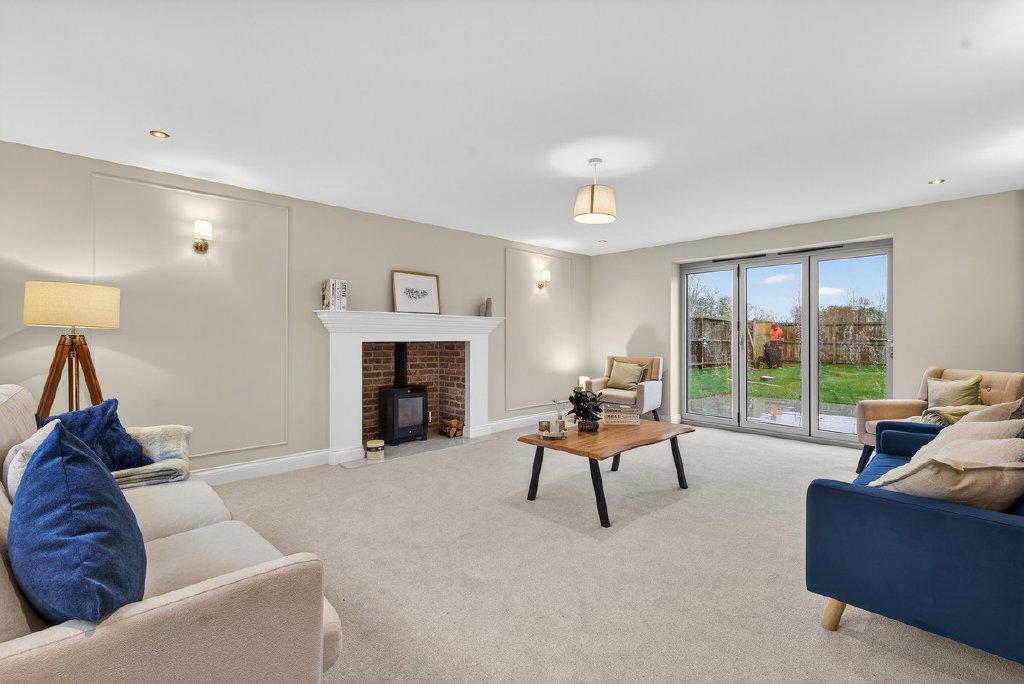 Designed with contemporary family living in mind, the ground floor accommodation includes a guest cloakroom and a generously proportioned utility/boot room, providing both rear garden access and internal access from the double garage—ideal for everyday practicality. The formal lounge offers a calm and comfortable retreat, enhanced by a feature chimney breast with wood-burning stove and bifold doors opening onto the garden. A separate study provides a dedicated and well-proportioned space ideal for home working.