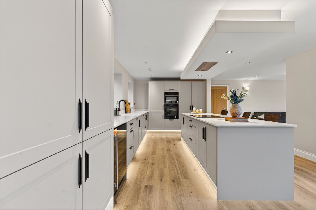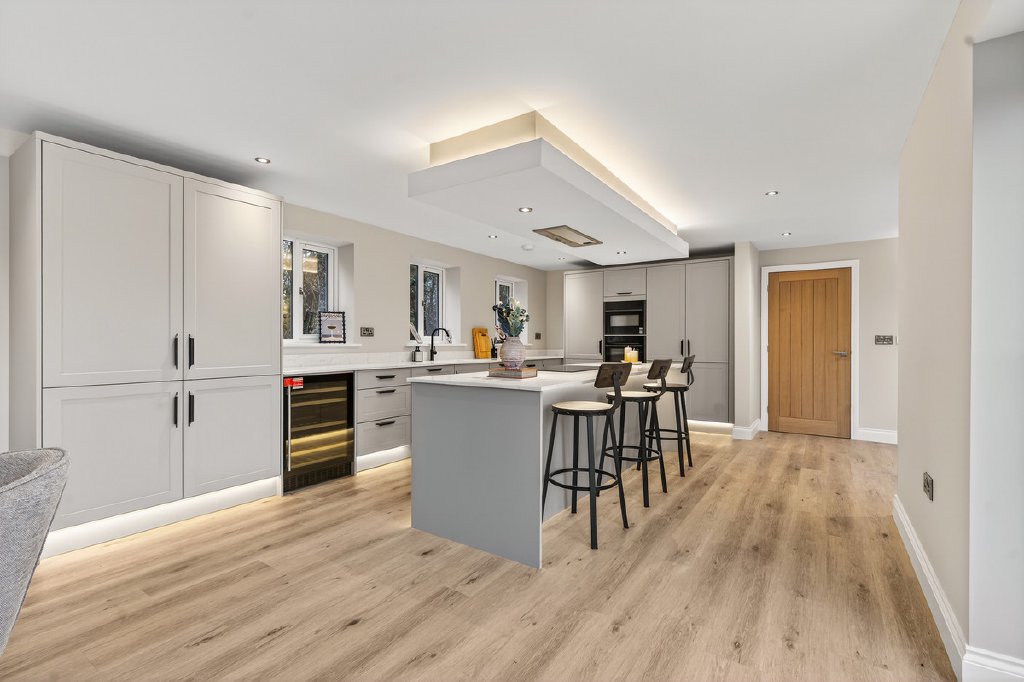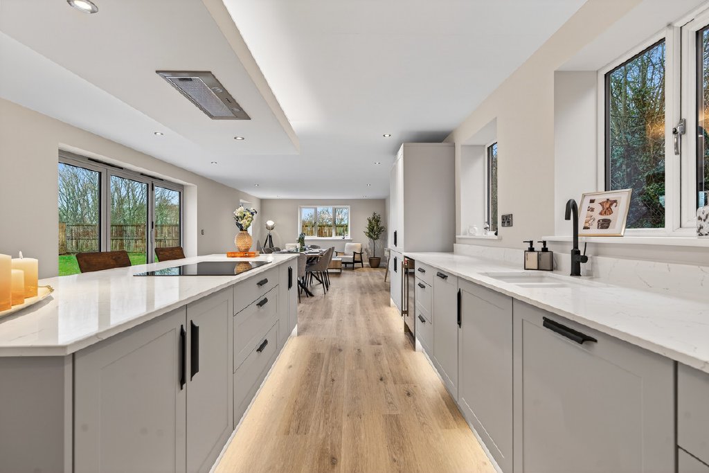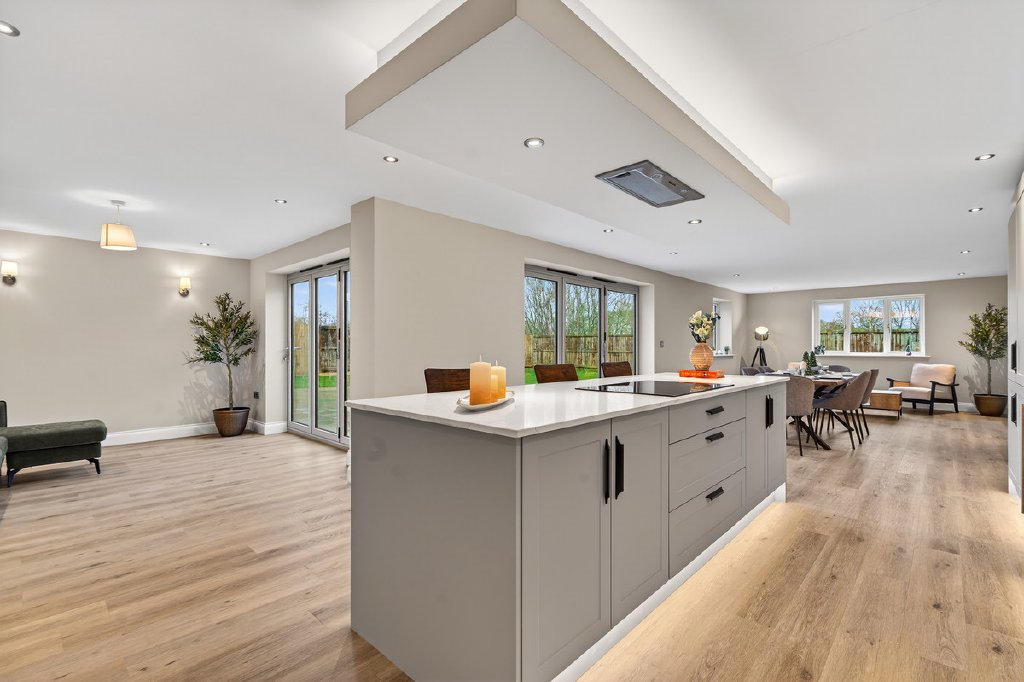 At the heart of the property lies a truly expansive L-shaped living kitchen, finished to an exceptional standard. This impressive space incorporates a large central island with breakfast bar, high-specification integrated appliances, and a dual-aspect layout. Two separate sets of bifold doors provide multiple access points to the rear garden, perfect for access to the extensive terrace and for the enjoyment of the well-proportioned lawns, all set within a desirable southerly plot. Natural light floods the space, making it perfectly suited to both everyday family living and larger-scale entertaining.