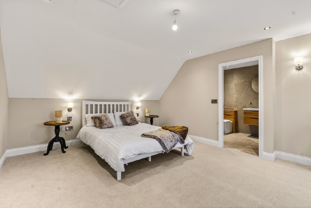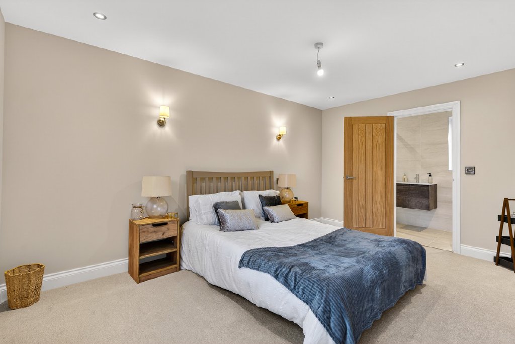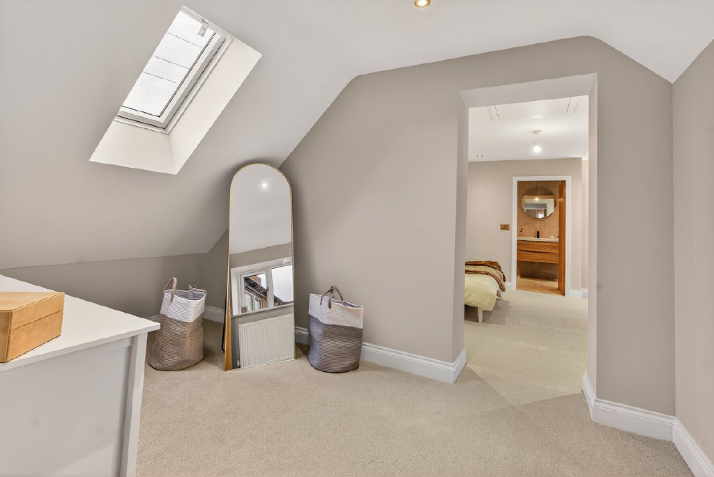 A spacious central landing gives access to five well-proportioned bedrooms, three of which benefit from stylish en-suites. The principal suite is a luxurious and private retreat, complete with a dedicated dressing room area and an exquisite ensuite featuring a freestanding bath, separate shower, and feature lighting, designed as a serene and sophisticated sanctuary. The remaining two bedrooms are served by a contemporary family bathroom, thoughtfully designed with a freestanding bath, separate shower, and feature lighting, providing a practical yet stylish space for everyday use.