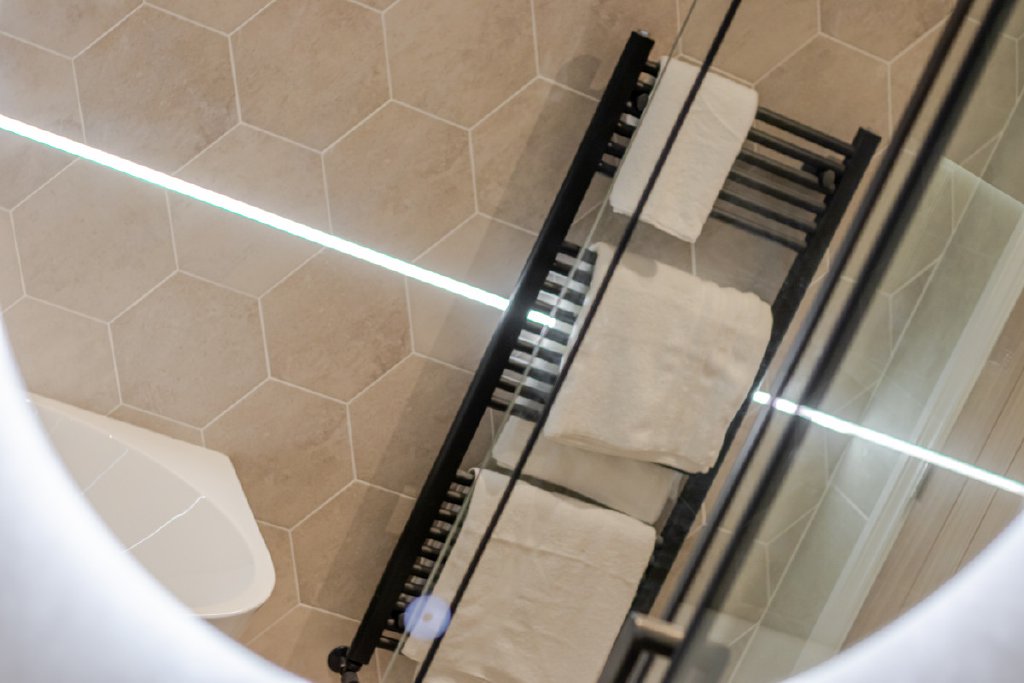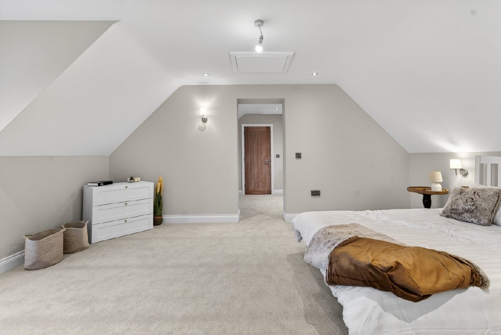 The first floor hosts five well-proportioned bedrooms, three of which benefit from stylish ensuites. The principal suite is a luxurious and private retreat, complete with a dedicated dressing room area and an exquisite ensuite featuring a freestanding bath, separate shower, and feature lighting, designed as a serene and sophisticated sanctuary. The remaining two bedrooms are served by a contemporary family bathroom, thoughtfully designed with a freestanding bath, separate shower, and feature lighting, providing a practical yet stylish space for everyday use.