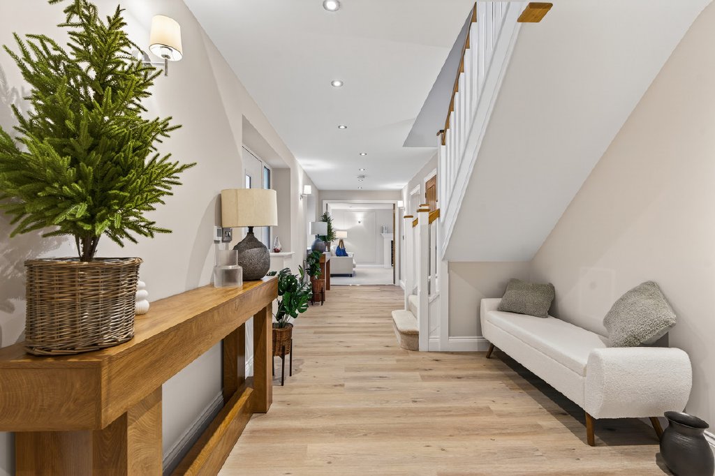 The home is approached via a striking canopied entrance, complete with a large skylight, providing a bright and welcoming arrival space. Thoughtfully designed for modern living, it offers practical provision for a delivery box, a wood store, or even a boot stand, combining style with everyday functionality. The entrance opens into a spacious reception hallway that immediately establishes the property’s refined yet highly functional character. This central hallway forms the core of the ground floor, providing access to all principal living spaces and featuring a striking staircase ascending to the first floor.