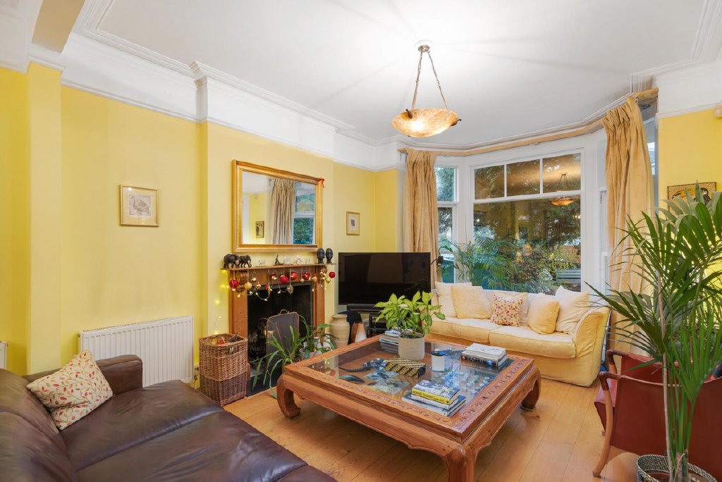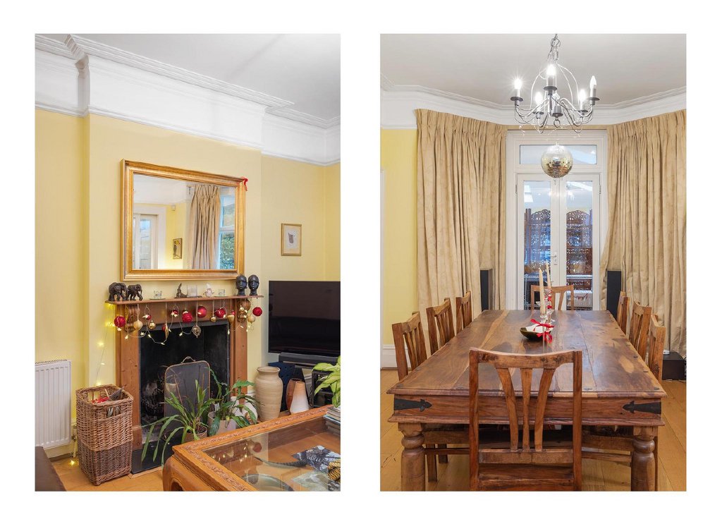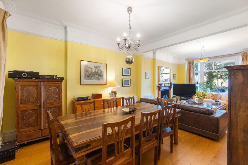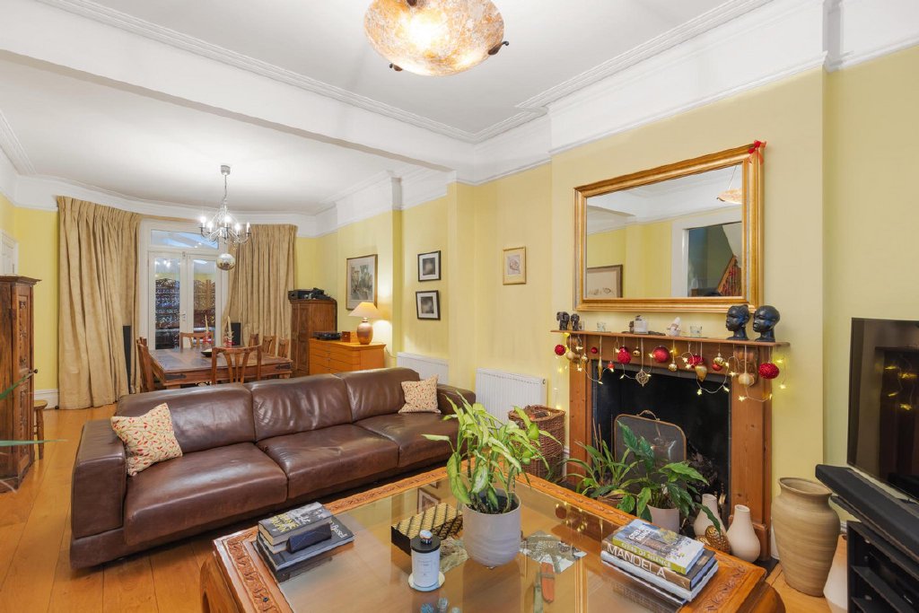 To the front, a gracious dual-aspect reception room is bathed in natural light, showcasing period character through a handsome splay bay window and an attractive feature fireplace. To the rear, a second reception room offers a more relaxed yet equally elegant setting, enhanced by rich walnut parquet flooring and French doors that lead directly onto a broad slate-paved terrace and the beautifully landscaped garden beyond, an ideal arrangement for entertaining and alfresco dining.