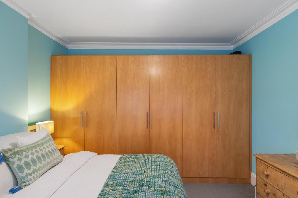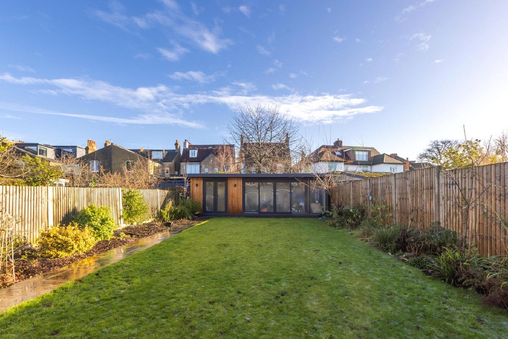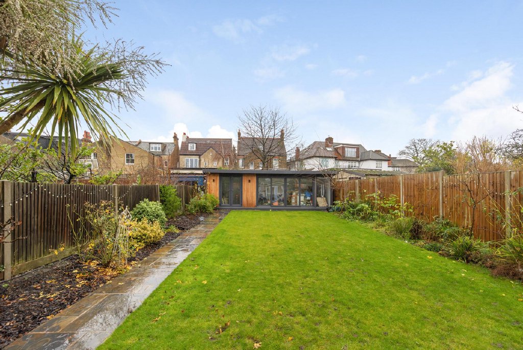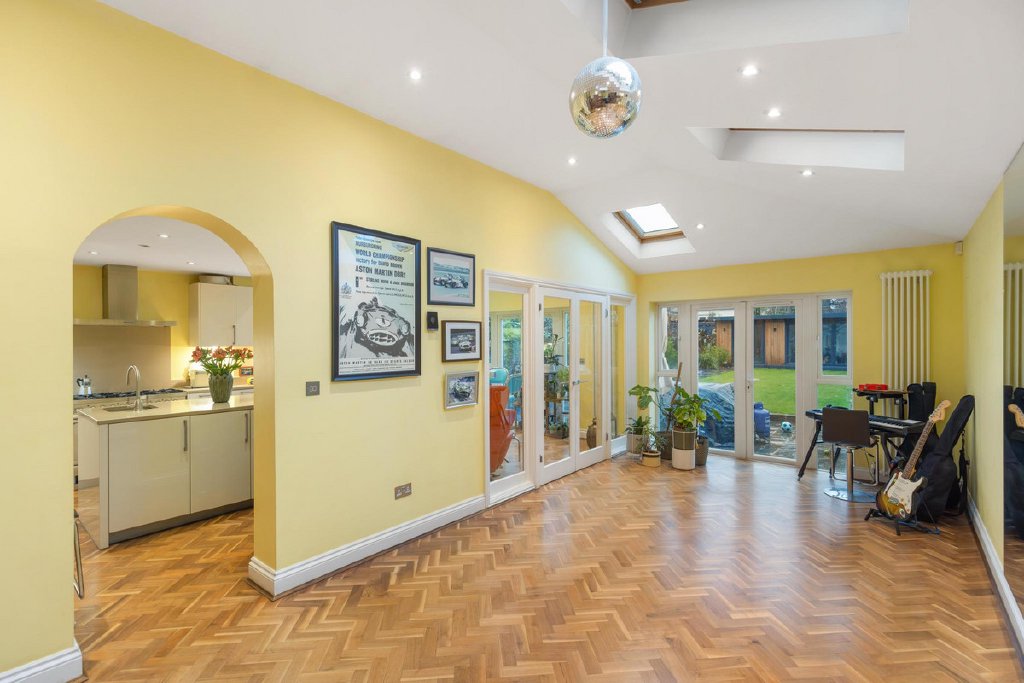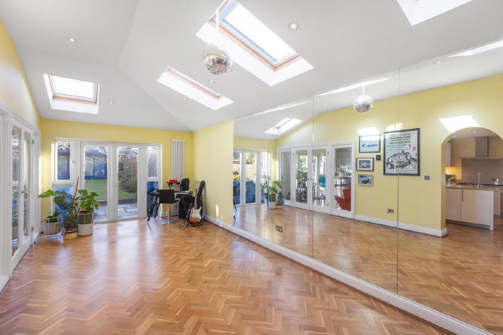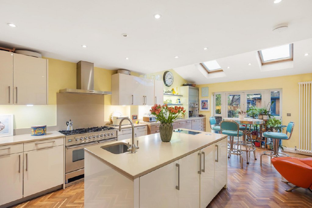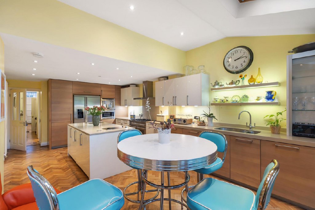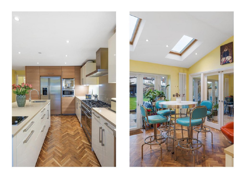 The heart of the home is the thoughtfully extended open-plan kitchen and dining space, designed with both family life and entertaining in mind. The kitchen is fitted with high-quality integrated appliances, generous bespoke cabinetry, Caesarstone worktops and a substantial central island incorporating an additional induction hob and preparation sink. French doors open directly onto the garden, creating a wonderful sense of flow between indoors and out.