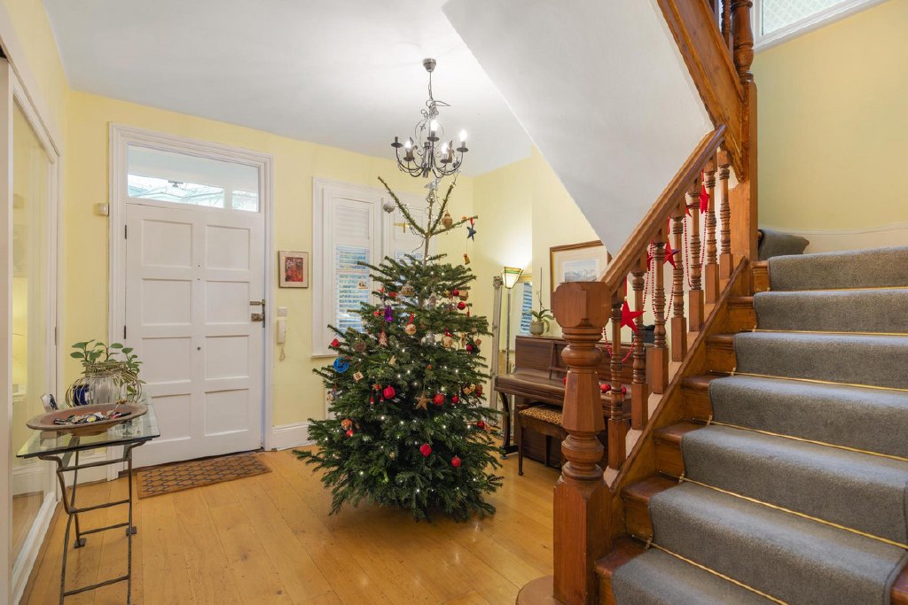 A substantial enclosed porch opens into a welcoming entrance hall, immediately impressive with its high corniced ceilings and refined wood flooring, establishing a tone of quiet sophistication that flows throughout the house.
