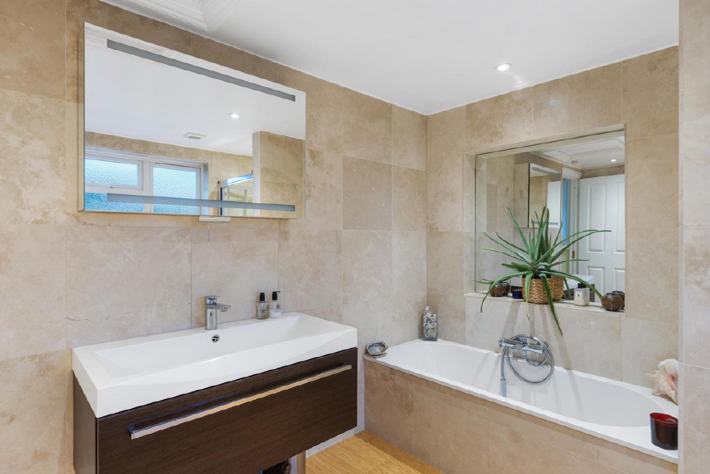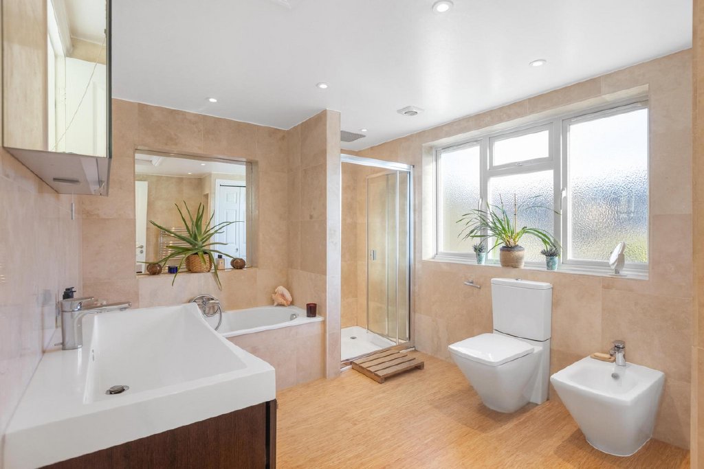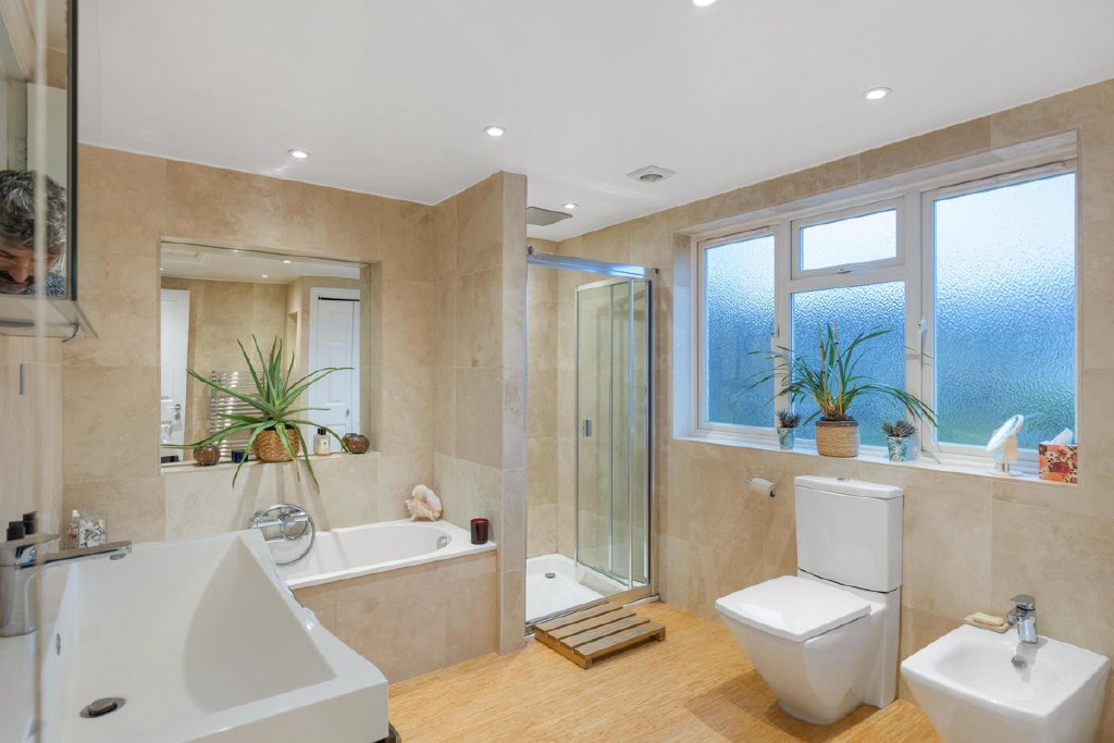 On the first floor, a spacious central landing leads to five well-proportioned double bedrooms. The principal bedroom enjoys serene views over the garden and benefits from bespoke fitted wardrobes. A luxuriously appointed family bathroom completes the floor, featuring a walk-in shower, separate bath and quality Villeroy & Boch sanitary ware, evoking a calm, spa-like atmosphere.