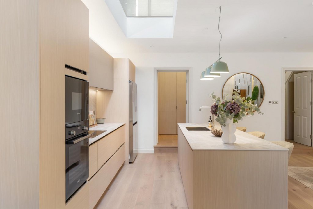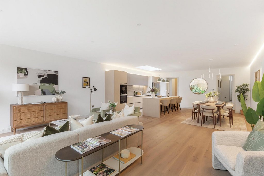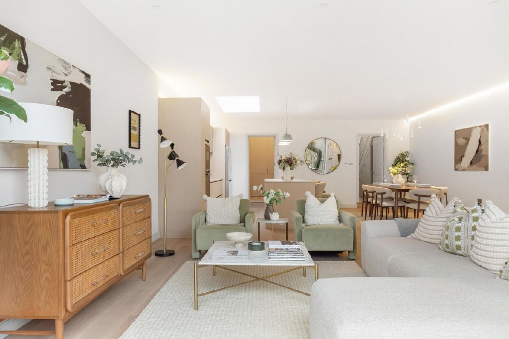 At the heart of the house lies a truly outstanding open-plan kitchen, reception and dining space, an impressive, light-filled environment designed for both everyday living and elegant entertaining. This expansive lateral living area forms the social centre of the home, seamlessly connecting cooking, dining and relaxation, while full-width sliding doors open directly onto the landscaped garden and terrace beyond. Skylights and large windows flood the space with natural light, creating an uplifting sense of volume and connection to the outdoors.