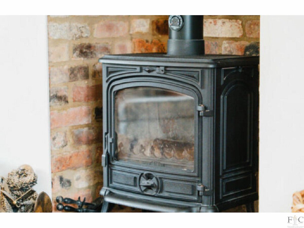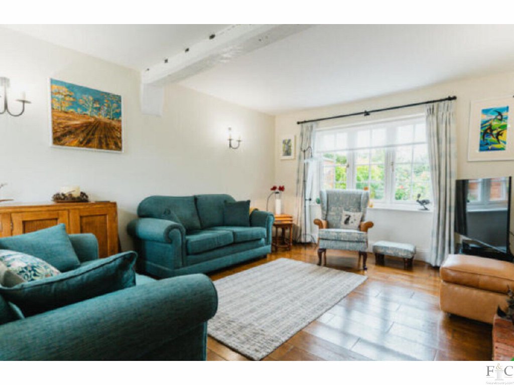 The sitting room is a delightful dual-aspect space filled with natural light. It features a multi-fuel stove set within a brick fireplace, exposed painted beam, and oak flooring that continues throughout the ground floor, adding warmth and character.
