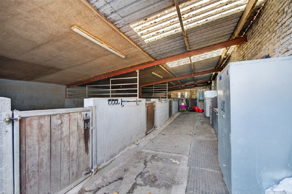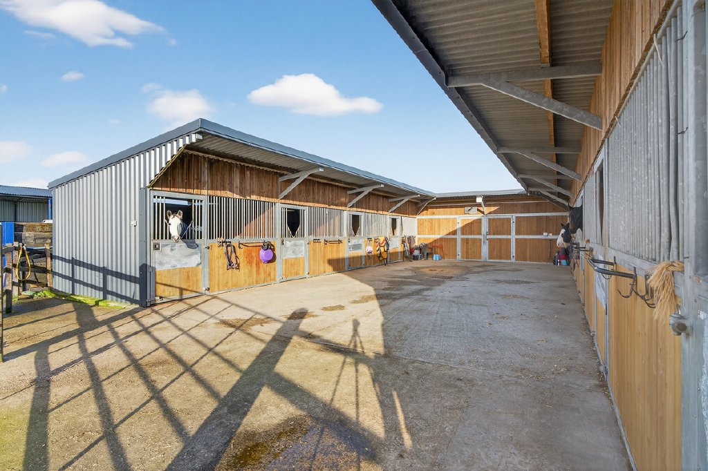 • U-Shaped Steel-Framed Building: Beyond the brick range, a modern purpose-built steel-framed U-shaped building with a cantilevered roof and fully drained concrete flooring contains 9 stables with associated tack and feed rooms, offering highly practical, low-maintenance facilities for multiple horses.